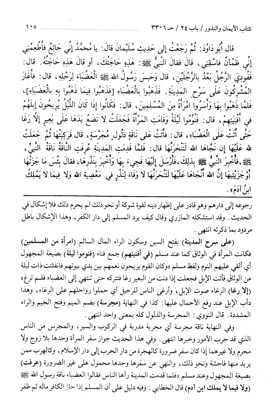 وَفِي هَذَا الْحَدِيثِ جَوَازُ سَفَرِ الْمَرْأَةِ وَحْدَهَا بِلَا زَوْجٍ وَلَا مَحْرَمٍ وَلَا غَيْرِهِمَا إِذَا كَانَ سَفَرَ ضَرُورَةٍ كَالْهِجْرَةِ مِنْ دَارِ الْحَرْبِ إِلَى دَارِ الْإِسْلَامِ وَكَالْهَرَبِ مِمَّنْ يُرِيدُ مِنْهَا فَاحِشَةً وَنَحْوِ ذَلِكَ وَالنَّهْيُ عَنْ سَفَرِهَا وَحْدَهَا مَحْمُولٌ عَلَى غَيْرِ الضَّرُورَةِ (عُرِفَتْ) بِصِيغَةِ الْمَجْهُولِ وَعِنْدَ مُسْلِمٍ فَلَمَّا قَدِمَتِ الْمَدِينَةَ رَآهَا النَّاسُ فَقَالُوا الْعَضْبَاءَ نَاقَةِ رَسُولِ اللَّهِ صَلَّى اللَّهُ عَلَيْهِ وَسَلَّمَ (وَلَا فيما لا يملك بن آدَمَ) قَالَ الْخَطَّابِيُّ وَفِيهِ دَلِيلٌ عَلَى أَنَّ الْمُسْلِمَ إِذَا حَازَ الْكَافِرُ مَالَهُ ثُمَّ ظَفِرَ