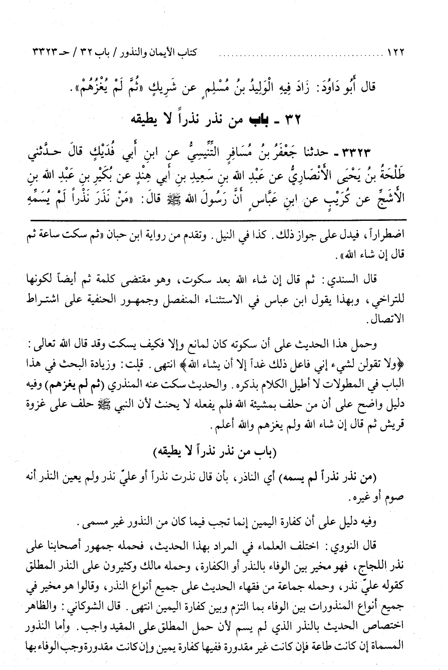 قَالَ الشَّوْكَانِيُّ وَالظَّاهِرُ اخْتِصَاصُ الْحَدِيثِ بِالنَّذْرِ الَّذِي لَمْ يُسَمَّ لِأَنَّ حَمْلَ الْمُطْلَقِ عَلَى الْقَيْدِ واجب