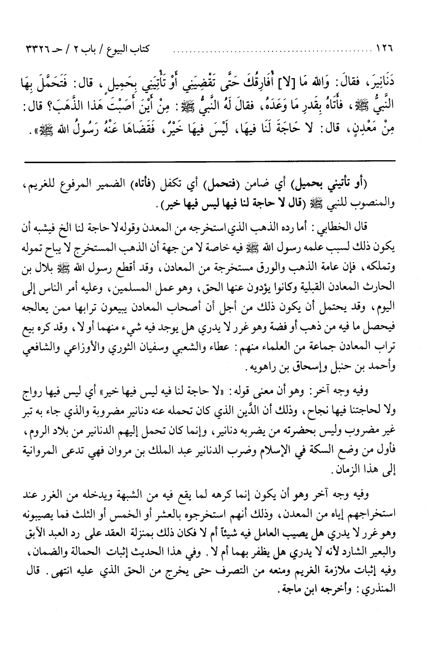 (أَوْ تَأْتِيَنِي بِحَمِيلٍ) أَيْ ضَامِنٍ (فَتَحَمَّلَ) أَيْ تَكَفَّلَ (فَأَتَاهُ) الضَّمِيرُ الْمَرْفُوعُ لِلْغَرِيمِ وَالْمَنْصُوبُ لِلنَّبِيِّ صَلَّى اللَّهُ عَلَيْهِ وَسَلَّمَ (قَالَ لَا حَاجَةَ لَنَا فِيهَا لَيْسَ فِيهَا خَيْرٌ) قَالَ الْخَطَّابِيُّ أَمَّا رَدُّهُ الذَّهَبَ الَّذِي اسْتَخْرَجَهُ مِنَ الْمَعْدِنِ وَقَوْلُهُ لَا حَاجَةَ لَنَا إِلَخْ فَيُشْبِهُ أَنْ يَكُونَ ذَلِكَ لِسَبَبٍ عَلَّمَهُ رَسُولُ اللَّهِ صَلَّى اللَّهُ عَلَيْهِ وَسَلَّمَ فِيهِ خَاصَّةً لَا مِنْ جِهَةِ أَنَّ الذَّهَبَ الْمُسْتَخْرَجَ لَا يُبَاحُ تَمَوُّلُهُ وَتَمَلُّكُهُ فَإِنَّ عَامَّةَ الذَّهَبِ وَالْوَرِقِ مُسْتَخْرَجَةٌ مِنَ الْمَعَادِنِ وَقَدْ أَقْطَعَ رَسُولُ اللَّهِ صَلَّى اللَّهُ عَلَيْهِ وَسَلَّمَ بِلَالَ بْنَ الْحَارِثِ الْمَعَادِنَ الْقَبَلِيَّةَ وَكَانُوا يُؤَدُّونَ عَنْهَا الْحَقَّ وَهُوَ عَمَلُ الْمُسْلِمِينَ وَعَلَيْهِ أَمْرُ النَّاسِ إِلَى الْيَوْمِ وَقَدْ يُحْتَمَلُ أَنْ يَكُونَ ذَلِكَ مِنْ أَجْلِ أَنَّ أَصْحَابَ الْمَعَادِنِ يَبِيعُونَ تُرَابَهَا مِمَّنْ يُعَالِجُهُ فَيَحْصُلُ مَا فِيهِ مِنْ ذَهَبٍ أَوْ فِضَّةٍ وَهُوَ غَرَرٌ لَا يُدْرَى هَلْ يُوجَدُ فِيهِ شَيْءٌ مِنْهُمَا أَوْ لَا وَقَدْ كَرِهَ بَيْعَ تُرَابِ الْمَعَادِنِ جَمَاعَةٌ مِنَ الْعُلَمَاءِ مِنْهُمْ عَطَاءٌ وَالشَّعْبِيُّ وَسُفْيَانُ الثَّوْرِيُّ وَالْأَوْزَاعِيُّ وَالشَّافِعِيِّ وَأَحْمَدَ بْنِ حَنْبَلٍ وَإِسْحَاقَ بْنِ رَاهْوَيْهِ
