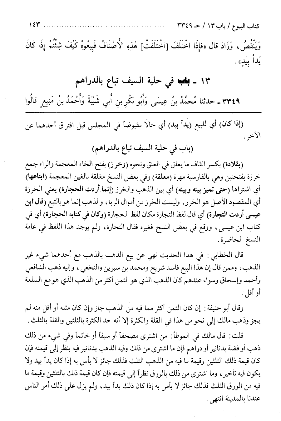قُلْتُ قَالَ مَالِكٌ فِي الْمُوَطَّأِ مَنِ اشْتَرَى مُصْحَفًا أَوْ سَيْفًا أَوْ خَاتَمًا وَفِي شَيْءٍ مِنْ ذَلِكَ ذَهَبٌ أَوْ فِضَّةٌ بِدَنَانِيرَ أَوْ دَرَاهِمَ فَإِنَّ مَا اشْتَرَى مِنْ ذَلِكَ وَفِيهِ الذَّهَبُ بِدَنَانِيرَ فَإِنَّهُ يَنْظُرُ إِلَى قِيمَتِهِ فَإِنْ كَانَ قِيمَةُ ذَلِكَ الثُّلُثَيْنِ وَقِيمَةُ مَا فِيهِ مِنَ الذَّهَبِ الثُّلُثُ فَذَلِكَ جَائِزٌ لَا بَأْسَ بِهِ إِذَا كَانَ يَدًا بِيَدٍ وَلَا يَكُونُ فِيهِ تَأْخِيرٌ وَمَا اشْتَرَى مِنْ ذَلِكَ بِالْوَرِقِ نَظَرًا إِلَى قِيمَتِهِ فَإِنْ كَانَ قِيمَةُ ذَلِكَ بِالثُّلُثَيْنِ وَقِيمَةُ مَا فِيهِ مِنَ الْوَرِقِ الثُّلُثُ فَذَلِكَ جَائِزٌ لَا بَأْسَ بِهِ إِذَا كَانَ ذَلِكَ يَدًا بِيَدٍ وَلَمْ يَزَلْ عَلَى ذَلِكَ أَمْرُ النَّاسِ عِنْدَنَا بِالْمَدِينَةِ انْتَهَى