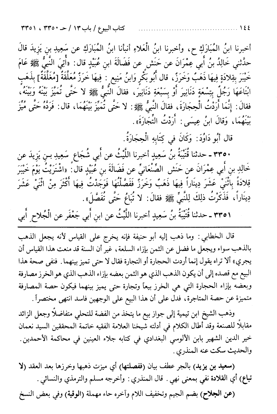 [3352] (سَعِيدُ بْنُ يَزِيدَ) بِالْجَرِّ عَطْفُ بَيَانٍ (فَفَصَّلْتُهَا) أَيْ مَيَّزْتُ ذَهَبَهَا وَخَرَزَهَا بَعْدَ الْعَقْدِ (لَا تُبَاعُ) أَيِ الْقِلَادَةُ نَفَيٌ بِمَعْنَى نَهَيٍ