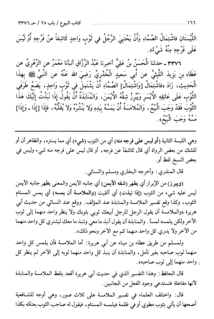 وَالْمُنَابَذَةُ أَنْ يَقُولَ أَنْبِذُ مَا مَعِي وَتَنْبِذُ مَا مَعَكَ لِيَشْتَرِيَ كُلُّ وَاحِدٍ مِنْهُمَا مِنَ الْآخَرِ وَلَا يَدْرِي كُلُّ وَاحِدٍ مِنْهُمَا كَمْ مَعَ الْآخَرِ وَنَحْوِ ذَلِكَ وَلِمُسْلِمٍ مِنْ طَرِيقِ عَطَاءِ بْنِ مِينَاءَ عَنْ أَبِي هُرَيْرَةَ أَمَّا الْمُلَامَسَةُ فَأَنْ يَلْمِسَ كُلُّ وَاحِدٍ مِنْهُمَا ثَوْبَ صَاحِبِهِ بِغَيْرِ تَأَمُّلٍ وَالْمُنَابَذَةُ أَنْ يَنْبِذَ كُلُّ وَاحِدٍ مِنْهُمَا ثَوْبَهُ إِلَى الْآخَرِ لَمْ يَنْظُرْ كُلُّ وَاحِدٍ مِنْهُمَا إِلَى ثَوْبِ صَاحِبِهِ قَالَ الْحَافِظُ وَهَذَا التَّفْسِيرُ الَّذِي فِي حَدِيثِ أَبِي هُرَيْرَةَ أَقْعَدُ بِلَفْظِ الْمُلَامَسَةِ وَالْمُنَابَذَةِ لِأَنَّهَا مُفَاعَلَةٌ فَتَسْتَدْعِي وُجُودَ الْفِعْلِ مِنَ الْجَانِبَيْنِ