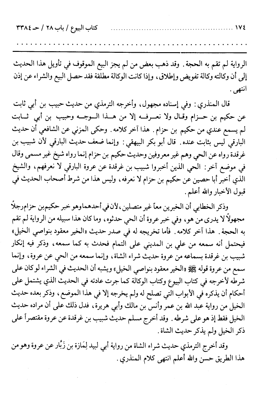 هَذَا آخِرُ كَلَامِهِ فَأَمَّا تَخْرِيجُهُ لَهُ فِي صَدْرِ حَدِيثِ الْخَيْرُ مَعْقُودٌ بِنَوَاصِي الْخَيْلِ فيحتمل أنه سمعه من علي بن الْمَدِينِيِّ عَلَى التَّمَامِ فَحَدَّثَ بِهِ كَمَا سَمِعَهُ وَذَكَرَ فِيهِ إِنْكَارَ شَبِيبِ بْنِ غَرْقَدَةَ بِسَمَاعِهِ مِنْ عُرْوَةَ حَدِيثَ شِرَاءِ الشَّاةِ وَإِنَّمَا سَمِعَهُ مِنَ الْحَيِّ عَنْ عُرْوَةَ وَإِنَّمَا سَمِعَ مِنْ عُرْوَةَ قَوْلَهُ صَلَّى اللَّهُ عَلَيْهِ وَسَلَّمَ الْخَيْرُ مَعْقُودٌ بِنَوَاصِي الْخَيْلِ وَيُشْبِهُ أَنَّ الْحَدِيثَ فِي الشِّرَاءِ لَوْ كَانَ عَلَى شَرْطِهِ لَأَخْرَجَهُ فِي كِتَابِ الْبُيُوعِ وَكِتَابِ الْوَكَالَةِ كَمَا جَرَتْ عَادَتُهُ فِي الْحَدِيثِ الَّذِي يَشْتَمِلُ عَلَى أَحْكَامٍ أَنْ يَذْكُرَهُ فِي الْأَبْوَابِ الَّتِي تَصْلُحُ لَهُ وَلَمْ يُخَرِّجْهُ إِلَّا فِي هَذَا الْمَوْضِعِ وَذَكَرَ بَعْدَهُ حَدِيثَ الْخَيْلِ مِنْ رِوَايَةِ عَبْدِ اللَّهِ بْنِ عُمَرَ وَأَنْسِ بْنِ مَالِكٍ وَأَبِي هُرَيْرَةَ فَدَلَّ ذَلِكَ عَلَى أَنَّ مُرَادَهُ حَدِيثُ الْخَيْلِ فَقَطْ إِذْ هُوَ عَلَى شَرْطِهِ