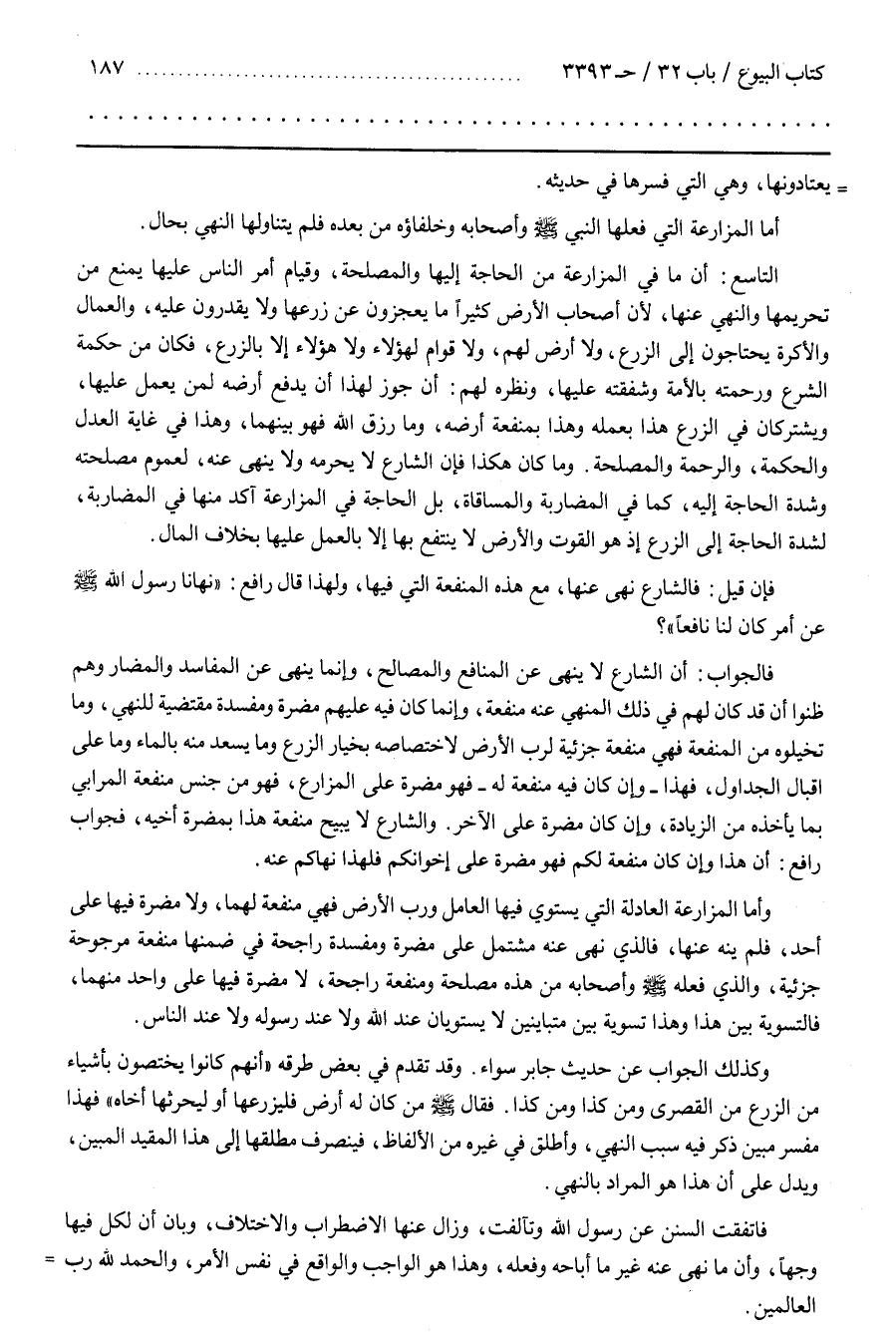 التَّاسِع أَنَّ مَا فِي الْمُزَارَعَة مِنْ الْحَاجَة إِلَيْهَا وَالْمَصْلَحَة وَقِيَام أَمْر النَّاس عَلَيْهَا يَمْنَع مِنْ تَحْرِيمهَا وَالنَّهْي عَنْهَا لِأَنَّ أَصْحَاب الْأَرْض كَثِيرًا مَا يَعْجِزُونَ عَنْ زَرْعهَا وَلَا يَقْدِرُونَ عَلَيْهِ وَالْعُمَّال وَالْأَكَرَة يَحْتَاجُونَ إِلَى الزَّرْع وَلَا أَرْض لَهُمْ وَلَا قِوَام لِهَؤُلَاءِ وَلَا هَؤُلَاءِ إِلَّا بِالزَّرْعِ فَكَانَ مِنْ حِكْمَة الشَّرْع وَرَحْمَته بِالْأُمَّةِ وَشَفَقَته عَلَيْهَا وَنَظَره لَهُمْ أَنْ جَوَّزَ لِهَذَا أَنْ يَدْفَع أَرْضه لِمَنْ يَعْمَل عَلَيْهَا وَيَشْتَرِكَانِ فِي الزَّرْع هَذَا بِعَمَلِهِ وَهَذَا بِمَنْفَعَةِ أَرْضه وَمَا رَزَقَ اللَّه فَهُوَ بَيْنهمَا وَهَذَا فِي غَايَة الْعَدْل وَالْحِكْمَة وَالرَّحْمَة وَالْمَصْلَحَة