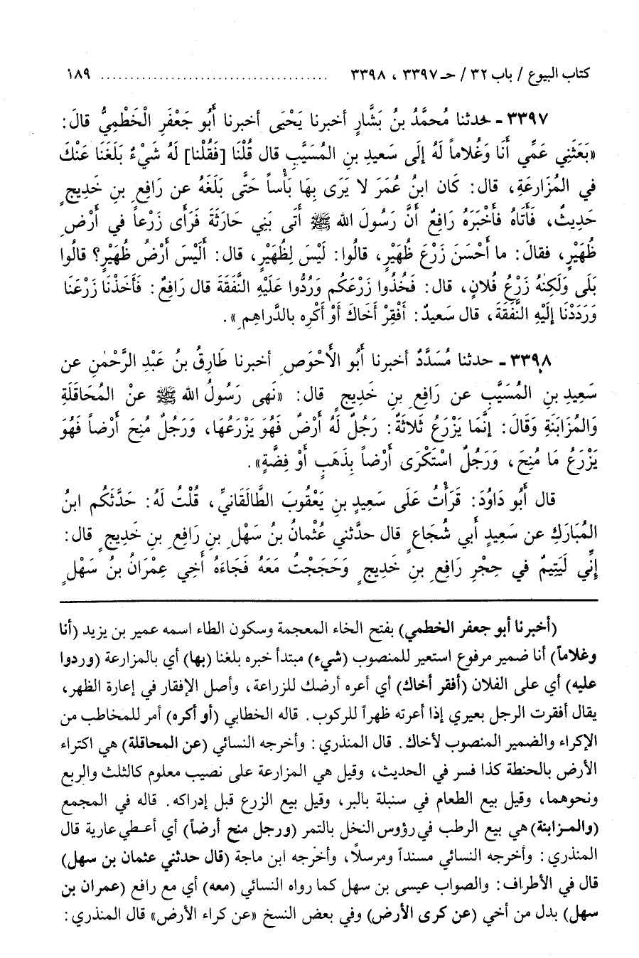 [3399] (أَخْبَرَنَا أَبُو جَعْفَرٍ الْخَطْمِيُّ) بِفَتْحِ الْخَاءِ الْمُعْجَمَةِ وَسُكُونِ الطَّاءِ اسْمُهُ عُمَيْرُ بْنُ يَزِيدَ (أَنَا وَغُلَامًا) أَنَا ضَمِيرٌ مَرْفُوعٌ اسْتُعِيرَ لِلْمَنْصُوبِ (شَيْءٌ) مُبْتَدَأٌ خَبَرُهُ بَلَغَنَا (بِهَا) أَيْ بِالْمُزَارَعَةِ (وَرُدُّوا عَلَيْهِ) أَيْ عَلَى الْفُلَانِ (أَفْقِرْ أَخَاكَ) أَيْ أَعِرْهُ أَرْضَكَ لِلزِّرَاعَةِ وَأَصْلُ الْإِفْقَارِ فِي إِعَارَةِ الظَّهْرِ يُقَالُ أَفْقَرْتُ الرَّجُلَ بَعِيرِي إِذَا أَعَرْتُهُ ظَهْرًا لِلرُّكُوبِ