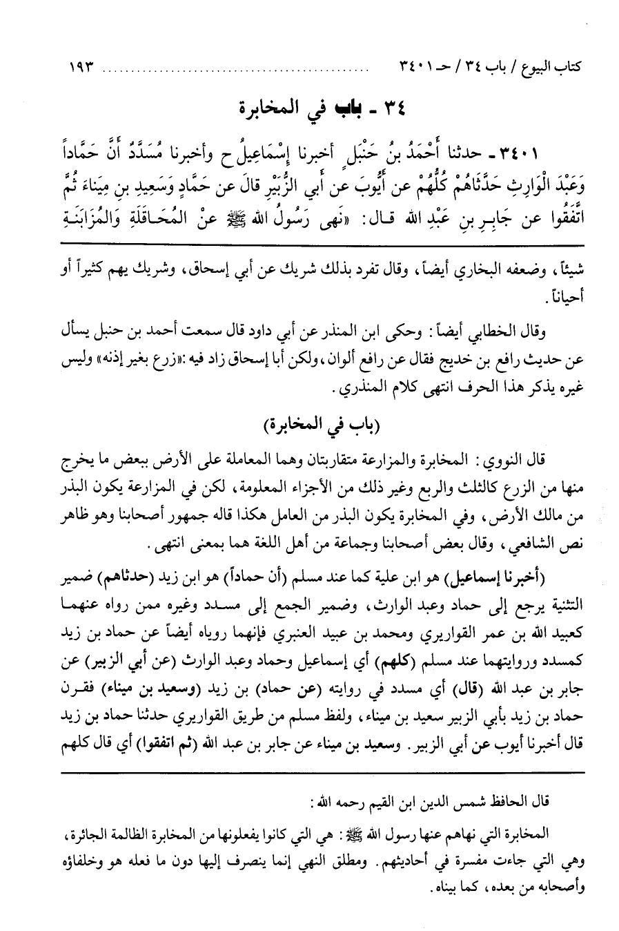 [3404] قَالَ النَّوَوِيُّ الْمُخَابَرَةُ وَالْمُزَارَعَةُ مُتَقَارِبَتَانِ وَهُمَا الْمُعَامَلَةُ عَلَى الْأَرْضِ بِبَعْضِ مَا يَخْرُجُ مِنْهَا مِنَ الزَّرْعِ كَالثُّلُثِ وَالرُّبُعِ وَغَيْرِ ذَلِكَ مِنَ الْأَجْزَاءِ الْمَعْلُومَةِ لَكِنْ فِي الْمُزَارَعَةِ يَكُونُ الْبَذْرُ مِنْ مَالِكِ الْأَرْضِ وَفِي الْمُخَابَرَةِ يَكُونُ الْبَذْرُ مِنَ الْعَامِلِ هَكَذَا قَالَهُ جُمْهُورُ أَصْحَابِنَا وَهُوَ ظَاهِرُ نَصِّ الشَّافِعِيِّ وَقَالَ بَعْضُ أَصْحَابِنَا وَجَمَاعَةٌ مِنْ أَهْلِ اللُّغَةِ هُمَا بِمَعْنًى انتهى (أخبرنا إسماعيل) هو بن عُلَيَّةَ كَمَا عِنْدَ مُسْلِمٍ (أَنَّ حَمَّادًا) هُوَ بن زَيْدٍ (حَدَّثَاهُمْ) ضَمِيرُ التَّثْنِيَةِ يَرْجِعُ إِلَى حَمَّادٍ وَعَبْدِ الْوَارِثِ وَضَمِيرُ الْجَمْعِ إِلَى مُسَدَّدٍ وَغَيْرِهِ مِمَّنْ رَوَاهُ عَنْهُمَا كَعُبَيْدِ اللَّهِ بْنِ عُمَرَ الْقَوَارِيرِيِّ وَمُحَمَّدِ بْنِ عُبَيْدٍ الْعَنْبَرِيِّ فَإِنَّهُمَا رَوَيَاهُ أَيْضًا عَنْ حَمَّادِ بْنِ زَيْدٍ كَمُسَدَّدٍ وَرِوَايَتُهُمَا عِنْدَ مُسْلِمٍ (كُلُّهُمْ) أَيْ إِسْمَاعِيلُ وَحَمَّادُ وَعَبْدُ الْوَارِثِ (عَنْ أَبِي الزُّبَيْرِ) عَنْ جَابِرِ بْنِ عَبْدِ اللَّهِ (قَالَ) أَيْ مُسَدَّدٌ فِي رِوَايَتِهِ (عَنْ حَمَّادِ) بْنِ زَيْدٍ (وَسَعِيدِ بْنِ مِينَاءَ) فَقَرَنَ حَمَّادُ بْنُ زَيْدٍ بِأَبِي الزُّبَيْرِ سَعِيدِ بْنِ مِينَاءَ وَلَفْظُ مُسْلِمٍ مِنْ طَرِيقِ الْقَوَارِيرِيِّ حَدَّثَنَا حَمَّادُ بْنُ زَيْدٍ قَالَ أَخْبَرَنَا أَيُّوبُ عَنْ أَبِي الزُّبَيْرِ