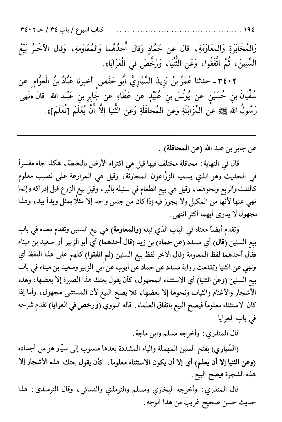 [3405] (السَّيَّارِيُّ) بِفَتْحِ السِّينِ الْمُهْمَلَةِ وَالْيَاءِ الْمُشَدَّدَةِ بَعْدَهَا مَنْسُوبٌ إِلَى سَيَّارٍ هُوَ مِنْ أَجْدَادِهِ (وَعَنِ الثُّنْيَا إِلَّا أَنْ يَعْلَمَ) أَيْ إِلَّا أَنْ يَكُونَ الِاسْتِثْنَاءُ مَعْلُومًا كَأَنْ يَقُولَ بِعْتُكَ هَذِهِ الْأَشْجَارَ إِلَّا هَذِهِ الشَّجَرَةَ فَيَصِحُّ الْبَيْعُ قَالَ الْمُنْذِرِيُّ وَأَخْرَجَهُ الْبُخَارِيُّ وَمُسْلِمٌ وَالتِّرْمِذِيُّ وَالنَّسَائِيُّ وَقَالَ التِّرْمِذِيُّ هَذَا حَدِيثٌ حَسَنٌ صَحِيحٌ غَرِيبٌ مِنْ هَذَا الوجه