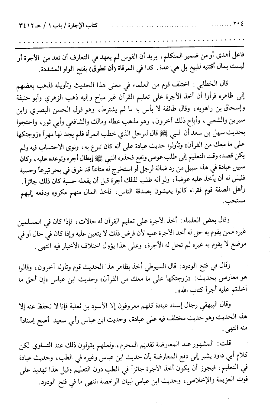 قَالَ الْخَطَّابِيُّ اخْتَلَفَ قَوْمٌ مِنَ الْعُلَمَاءِ فِي مَعْنَى هَذَا الْحَدِيثِ وَتَأْوِيلِهِ فَذَهَبَ بَعْضُهُمْ إِلَى ظَاهِرِهِ فَرَأَوْا أَنَّ أَخْذَ الْأُجْرَةِ عَلَى تَعْلِيمِ الْقُرْآنِ غَيْرُ مُبَاحٍ وَإِلَيْهِ ذَهَبَ الزُّهْرِيُّ وَأَبُو حَنِيفَةَ وَإِسْحَاقُ بن رَاهْوَيْهِ وَقَالَ طَائِفَةٌ لَا بَأْسَ بِهِ مَا لم يشترط وهو قول الحسن البصري وبن سِيرِينَ وَالشَّعْبِيِّ وَأَبَاحَ ذَلِكَ آخَرُونَ وَهُوَ مَذْهَبُ عَطَاءٍ وَمَالِكٍ وَالشَّافِعِيِّ وَأَبِي ثَوْرٍ وَاحْتَجُّوا بِحَدِيثِ سَهْلِ بْنِ سَعْدٍ أَنَّ النَّبِيَّ صَلَّى اللَّهُ عَلَيْهِ وَسَلَّمَ قَالَ لِلرَّجُلِ الَّذِي خَطَبَ الْمَرْأَةَ فَلَمْ يَجِدْ لَهَا مَهْرًا زَوَّجْتُكَهَا عَلَى مَا مَعَكَ مِنَ الْقُرْآنِ وَتَأَوَّلُوا حَدِيثَ عُبَادَةَ عَلَى أَنَّهُ كَانَ تَبَرَّعَ بِهِ وَنَوَى الِاحْتِسَابَ فِيهِ وَلَمْ يَكُنْ قَصْدُهُ وَقْتَ التَّعْلِيمِ إِلَى طَلَبِ عِوَضٍ وَنَفْعٍ فَحَذَّرَهُ النَّبِيُّ صَلَّى اللَّهُ عَلَيْهِ وَسَلَّمَ إِبْطَالَ أَجْرِهِ وَتَوَعَّدَهُ عَلَيْهِ وَكَانَ سَبِيلُ عُبَادَةَ فِي هَذَا سَبِيلَ مَنْ رَدَّ ضَالَّةً لِرَجُلٍ أَوِ اسْتَخْرَجَ لَهُ مَتَاعًا قَدْ غَرِقَ فِي بَحْرٍ تَبَرُّعًا وَحِسْبَةً فَلَيْسَ لَهُ أَنْ يَأْخُذَ عَلَيْهِ عِوَضًا وَلَوْ أَنَّهُ طَلَبَ لِذَلِكَ أُجْرَةً قَبْلَ أَنْ يَفْعَلَهُ حِسْبَةً كَانَ ذَلِكَ جَائِزًا