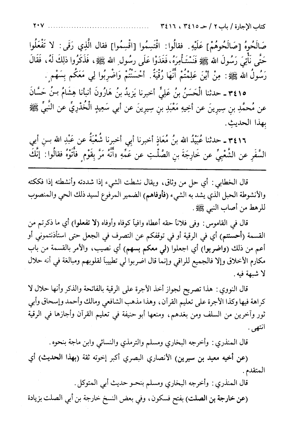 قَالَ النَّوَوِيُّ هَذَا تَصْرِيحٌ لِجَوَازِ أَخْذِ الْأُجْرَةِ عَلَى الرُّقْيَةِ بِالْفَاتِحَةِ وَالذِّكْرِ وَأَنَّهَا حَلَالٌ لَا كَرَاهَةَ فِيهَا وَكَذَا الْأُجْرَةُ عَلَى تَعْلِيمِ الْقُرْآنِ وَهَذَا مَذْهَبُ الشَّافِعِيِّ وَمَالِكٍ وَأَحْمَدَ وَإِسْحَاقَ وَأَبِي ثَوْرٍ وَآخَرِينَ مِنَ السَّلَفِ وَمَنْ بَعْدَهُمْ وَمَنَعَهَا أَبُو حَنِيفَةَ فِي تَعْلِيمِ الْقُرْآنِ وَأَجَازَهَا فِي الرُّقْيَةِ انْتَهَى