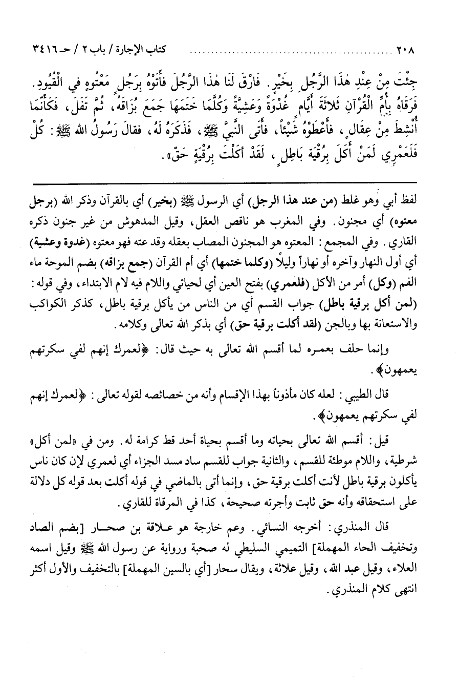 وَفِي الْمَجْمَعِ الْمَعْتُوهُ هُوَ الْمَجْنُونُ الْمُصَابُ بِعَقْلِهِ وَقَدْ عَتَهَ فَهُوَ مَعْتُوهٌ (غَدْوَةً وَعَشِيَّةً) أَيْ أَوَّلَ النَّهَارِ وَآخِرَهُ أَوْ نَهَارًا وَلَيْلًا (وَكُلَّمَا خَتَمَهَا) أَيْ أُمَّ الْقُرْآنِ (جَمَعَ بُزَاقَهُ) بِضَمِّ الْمُوَحَّدَةِ مَاءُ الْفَمِ (كُلْ) أَمْرٌ مِنَ الْأَكْلِ (فَلَعَمْرِي) بِفَتْحِ الْعَيْنِ أَيْ لَحَيَاتِي وَاللَّامُ فِيهِ لَامُ الِابْتِدَاءِ وَفِي قَوْلِهِ (لَمَنْ أَكَلَ بِرُقْيَةِ بَاطِلٍ) جَوَابُ الْقَسَمِ أَيْ وَاللَّامُ فِيهِ لَامُ الِابْتِدَاءِ وَفِي قَوْلِهِ (لَمَنْ أَكَلَ بِرُقْيَةِ بَاطِلٍ) جَوَابُ الْقَسَمِ أَيْ مِنَ النَّاسِ مَنْ يَأْكُلُ بِرُقْيَةِ بَاطِلٍ كَذِكْرِ الْكَوَاكِبِ وَالِاسْتِعَانَةِ بِهَا وَبِالْجِنِّ (لَقَدْ أَكَلْتَ بِرُقْيَةِ حَقٍّ) أَيْ بِذِكْرِ اللَّهِ تَعَالَى وَكَلَامِهِ