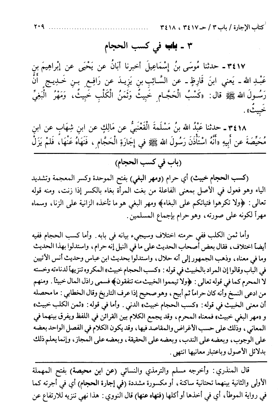 [3422] (عن بن مُحَيْصَةَ) بِفَتْحِ الْمُهْمَلَةِ الْأُولَى وَالثَّانِيَةِ بَيْنَهُمَا تَحْتَانِيَّةٌ سَاكِنَةٌ أَوْ مَكْسُورَةٌ مُشَدَّدَةٌ (فِي إِجَارَةِ الْحَجَّامِ) أَيْ فِي أُجْرَتِهِ كَمَا فِي رِوَايَةِ الْمُوَطَّأِ أَيْ فِي أَخْذِهَا أَوْ أَكْلِهَا (فَنَهَاهُ عَنْهَا) قَالَ النَّوَوِيُّ هَذَا نَهْيُ تَنْزِيهٍ لِلِارْتِفَاعِ