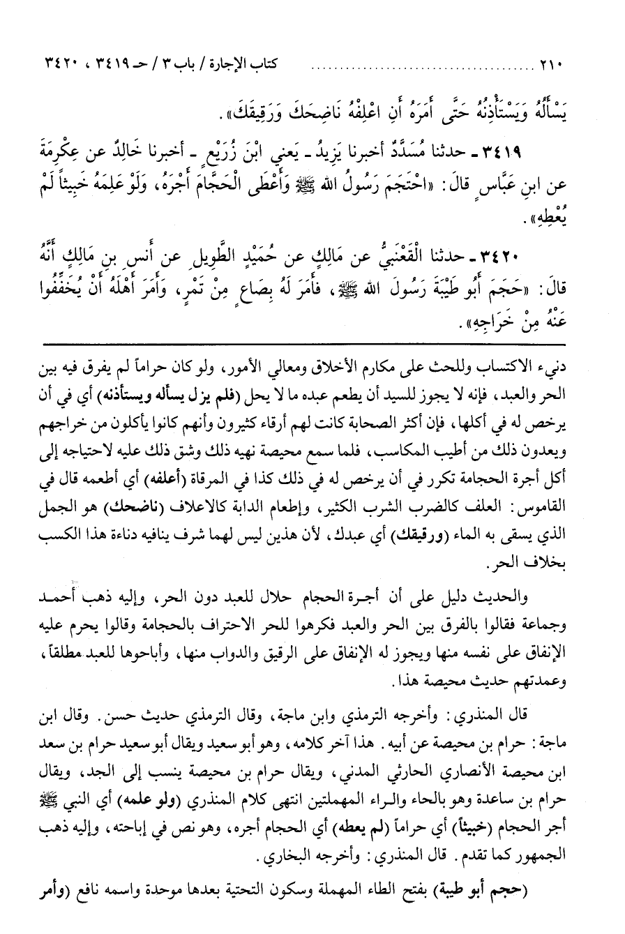 وَالْحَدِيثُ دَلِيلٌ عَلَى أَنَّ أُجْرَةَ الْحَجَّامِ حَلَالٌ لِلْعَبْدِ دُونَ الْحُرِّ