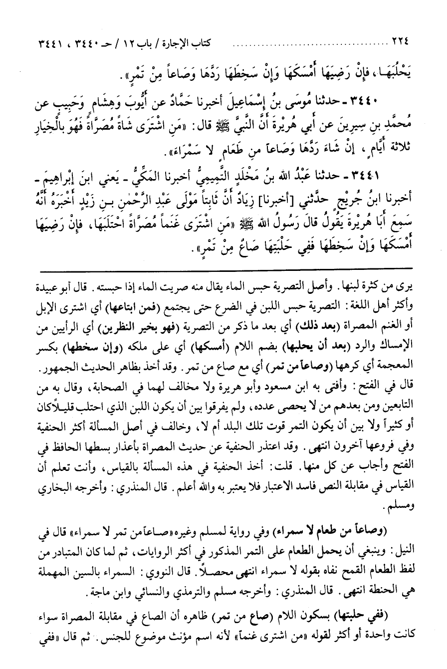 قَالَ أَبُو عُبَيْدَةَ وَأَكْثَرُ أَهْلِ اللُّغَةِ التَّصْرِيَةُ حَبْسُ اللَّبَنِ فِي الضَّرْعِ حَتَّى يَجْتَمِعَ (فَمَنِ ابْتَاعَهَا) أَيِ اشْتَرَى الْإِبِلَ أو الغنم المصراة (بعد ذلك) أي بعد ما ذَكَرَ مِنَ التَّصْرِيَةِ (فَهُوَ بِخَيْرِ النَّظَرَيْنِ) أَيِ الرَّأْيَيْنِ مِنَ الْإِمْسَاكِ وَالرَّدِّ (بَعْدَ أَنْ يَحْلُبَهَا) بِضَمِّ اللَّامِ (أَمْسَكَهَا) أَيْ عَلَى مِلْكِهِ (وَإِنْ سَخِطَهَا) بِكَسْرِ الْمُعْجَمَةِ أَيْ كَرِهَهَا (وَصَاعًا مِنْ تَمْرٍ) أَيْ مَعَ صَاعٍ مِنْ تَمْرٍ