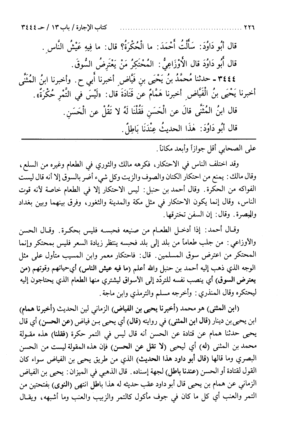 [3448] (بن الْمُثَنَّى) هُوَ مُحَمَّدٌ (أَخْبَرَنَا يَحْيَى بْنُ الْفَيَّاضِ) الزِّمَانِيُّ لَيِّنُ الْحَدِيثِ (أَخْبَرَنَا هَمَّامُ) بْنُ يَحْيَى بن دينار (قال بن الْمُثَنَّى) فِي رِوَايَتِهِ (قَالَ) أَيْ يَحْيَى بْنُ فَيَّاضٍ (عَنِ الْحَسَنِ) أَيْ قَالَ يَحْيَى حَدَّثَنَا هَمَّامٌ عَنْ قَتَادَةَ عَنِ الْحَسَنِ أَنَّهُ قَالَ لَيْسَ فِي التَّمْرِ حُكْرَةٌ (فَقُلْنَا) هَذِهِ مَقُولَةُ مُحَمَّدِ بْنِ الْمُثَنَّى (لَهُ) أَيْ لِيَحْيَى (لَا تَقُلْ عَنِ الْحَسَنِ) فَإِنَّ هَذِهِ الْمَقُولَةَ لَيْسَتْ مِنَ الْحَسَنِ الْبَصْرِيِّ وَمَا قَالَهَا (قَالَ أَبُو دَاوُدَ هَذَا الْحَدِيثُ) الَّذِي مِنْ طَرِيقِ يَحْيَى بْنِ الْفَيَّاضِ سَوَاءٌ كَانَ الْقَوْلُ لِقَتَادَةَ أَوِ الْحَسَنِ (عِنْدَنَا بَاطِلٌ) لِجِهَةِ إِسْنَادِهِ