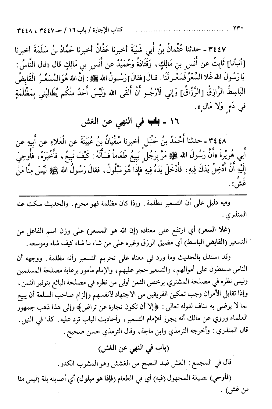 وَوَجْهُهُ أَنَّ النَّاسَ مُسَلَّطُونَ عَلَى أَمْوَالِهِمْ وَالتَّسْعِيرُ حَجْرٌ عَلَيْهِمْ وَالْإِمَامُ مَأْمُورٌ بِرِعَايَةِ مَصْلَحَةِ الْمُسْلِمِينَ وَلَيْسَ نَظَرُهُ فِي مَصْلَحَةِ الْمُشْتَرِي بِرُخْصِ الثَّمَنِ أَوْلَى مِنْ نَظَرِهِ فِي مَصْلَحَةِ الْبَائِعِ بِتَوْفِيرِ الثَّمَنِ وَإِذَا تَقَابَلَ الْأَمْرَانِ وَجَبَ تَمْكِينُ الْفَرِيقَيْنِ مِنَ الِاجْتِهَادِ لِأَنْفُسِهِمْ وَإِلْزَامِ صَاحِبِ السِّلْعَةِ أَنْ يَبِيعَ بِمَا لَا يَرْضَى بِهِ مُنَافٍ لِقَوْلِهِ تَعَالَى إِلَّا أَنْ تَكُونَ تِجَارَةً عَنْ تراض وَإِلَى هَذَا ذَهَبَ جُمْهُورُ الْعُلَمَاءِ وَرُوِيَ عَنْ مَالِكٍ أَنَّهُ يَجُوزُ لِلْإِمَامِ التَّسْعِيرُ وَأَحَادِيثُ الْبَابِ تَرُدُّ عَلَيْهِ