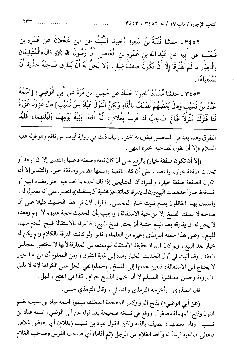 [3456] (إِلَّا أَنْ تَكُونَ صَفْقَةُ خِيَارٍ) بِالرَّفْعِ عَلَى أَنَّ كَانَ تَامَّةٌ وصفقة فَاعِلُهَا وَالتَّقْدِيرُ إِلَّا أَنْ تُوجَدَ أَوْ تَحْدُثَ صَفْقَةُ خِيَارٍ وَالنَّصْبُ عَلَى أَنَّ كَانَ نَاقِصَةٌ واسمها مضمر وصفقة خَبَرٌ وَالتَّقْدِيرُ إِلَّا أَنْ تَكُونَ الصَّفْقَةَ خِيَارٍ وَالْمُرَادُ أَنَّ الْمُتَبَايِعَيْنِ إِذَا قَالَ أَحَدُهُمَا لِصَاحِبِهِ اخْتَرْ إِمْضَاءَ الْبَيْعِ أَوْ فَسْخَهُ فَاخْتَارَ أَحَدُهُمَا تَمَّ الْبَيْعُ وَإِنْ لَمْ يَتَفَرَّقَا كَمَا تَقَدَّمَ (خَشْيَةَ أَنْ يَسْتَقِيلَهُ) بِالنَّصْبِ عَلَى أَنَّهُ مَفْعُولٌ لَهُ