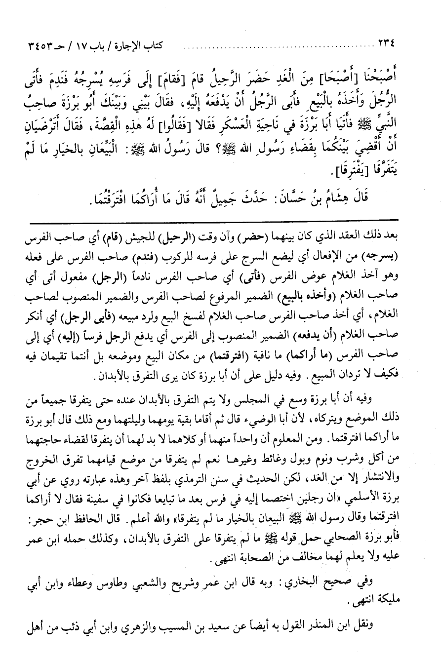 بَعْدَ ذَلِكَ الْعَقْدِ الَّذِي كَانَ بَيْنَهُمَا (حَضَرَ) وَآنَ وَقْتُ (الرَّحِيلِ) لِلْجَيْشِ (قَامَ) أَيْ صَاحِبُ الْفَرَسِ (يُسَرِّجُهُ) مِنَ الْإِفْعَالِ أَيْ لِيَضَعَ السَّرْجَ عَلَى فَرَسِهِ لِلرُّكُوبِ (فَنَدِمَ) صَاحِبُ الْفَرَسِ عَلَى فِعْلِهِ وَهُوَ آخِذٌ الْغُلَامَ عِوَضَ الْفَرَسِ (فَأَتَى) أَيْ صَاحِبَ الْفَرَسِ نَادِمًا (الرَّجُلَ) مَفْعُولُ أَتَى أَيْ صَاحِبَ الْغُلَامِ (وَأَخَذَهُ بِالْبَيْعِ) الضَّمِيرُ الْمَرْفُوعُ لِصَاحِبِ الْفَرَسِ وَالضَّمِيرُ الْمَنْصُوبُ لِصَاحِبِ الْغُلَامِ أَيْ أَخْذَ صَاحِبُ الْفَرَسِ صَاحِبَ الْغُلَامِ لِفَسْخِ الْبَيْعِ وَلِرَدِّ مَبِيعِهِ (فَأَبَى الرَّجُلُ) أَيْ أَنْكَرَ صَاحِبُ الْغُلَامِ (أَنْ يَدْفَعَهُ) الضَّمِيرُ الْمَنْصُوبُ إِلَى الْفَرَسِ أَيْ يَدْفَعُ الرَّجُلُ فَرَسًا (إِلَيْهِ) أَيْ إِلَى صَاحِبِ الْفَرَسِ (مَا أَرَاكُمَا) مَا نَافِيَةٌ (افْتَرَقْتُمَا) مِنْ مَكَانِ الْبَيْعِ وَمَوْضِعِهِ بَلْ أَنْتُمَا تُقِيمَانِ فِيهِ فَكَيْفَ لَا تَرُدَّانِ الْمَبِيعَ