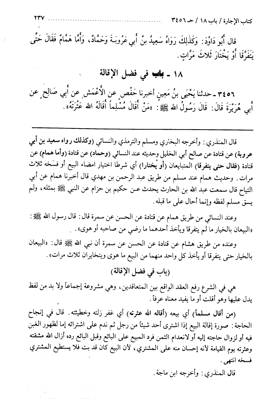 [3460] هِيَ فِي الشَّرْعِ رَفْعُ الْعَقْدِ الْوَاقِعِ بَيْنَ الْمُتَعَاقِدَيْنِ وَهِيَ مَشْرُوعَةٌ إِجْمَاعًا وَلَا بُدَّ مِنْ لَفْظٍ يَدُلُّ عَلَيْهَا وَهُوَ أَقَلْتُ أَوْ مَا يُفِيدُ مَعْنَاهُ عُرْفًا (مَنْ أَقَالَ مُسْلِمًا) أَيْ بَيْعَهُ (أَقَالَهُ اللَّهُ عَثْرَتَهُ) أَيْ غَفَرَ زَلَّتَهُ وَخَطِيئَتَهُ