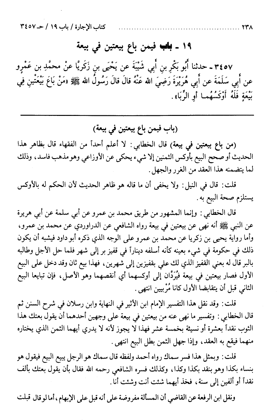 [3461] (مَنْ بَاعَ بَيْعَتَيْنِ فِي بَيْعَةٍ) قَالَ الْخَطَّابِيُّ لَا أَعْلَمُ أَحَدًا مِنَ الْفُقَهَاءِ قَالَ بِظَاهِرِ هَذَا الْحَدِيثِ أَوْ صَحَّحَ الْبَيْعَ بِأَوْكَسِ الثَّمَنَيْنِ إِلَّا شَيْءٌ يُحْكَى عَنِ الْأَوْزَاعِيِّ وَهُوَ مَذْهَبٌ فَاسِدٌ وَذَلِكَ لِمَا يَتَضَمَّنُهُ هَذَا الْعَقْدُ مِنَ الْغَرَرِ وَالْجَهْلِ