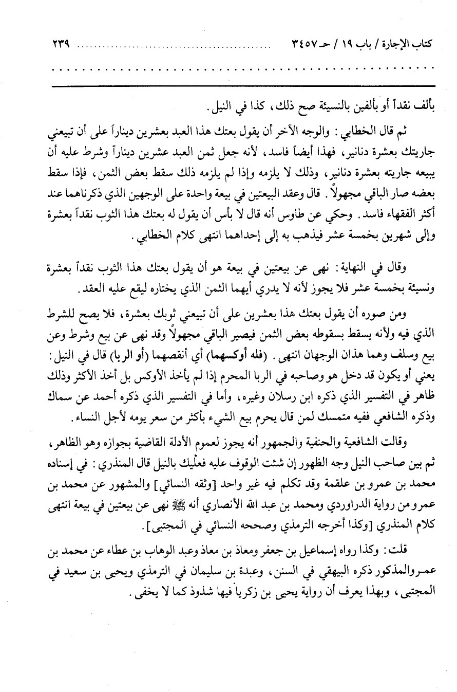 وَقَالَتِ الشَّافِعِيَّةُ وَالْحَنَفِيَّةُ وَالْجُمْهُورُ أَنَّهُ يَجُوزُ لِعُمُومِ الْأَدِلَّةِ الْقَاضِيَةِ بِجَوَازِهِ وَهُوَ الظَّاهِرُ ثُمَّ بَيَّنَ صَاحِبُ النَّيْلِ وَجْهَ الظُّهُورِ إِنْ شِئْتَ الْوُقُوفَ عَلَيْهِ فَعَلَيْكَ بِالنَّيْلِ قَالَ الْمُنْذِرِيُّ فِي إِسْنَادِهِ مُحَمَّدُ بْنُ عَمْرِو بْنِ عَلْقَمَةَ وَقَدْ تَكَلَّمَ فِيهِ غَيْرُ وَاحِدٍ (وَثَّقَهُ النَّسَائِيُّ) وَالْمَشْهُورُ عَنْ مُحَمَّدِ بْنِ عَمْرِو مِنْ رِوَايَةِ الدَّرَاوَرْدِيِّ وَمُحَمَّدُ بْنُ عَبْدِ اللَّهِ الْأَنْصَارِيُّ أَنَّهُ صَلَّى اللَّهُ عَلَيْهِ وَسَلَّمَ نَهَى عَنْ بَيْعَتَيْنِ فِي بَيْعَةٍ انْتَهَى كَلَامُ الْمُنْذِرِيِّ (وَكَذَا أَخْرَجَهُ التِّرْمِذِيُّ وَصَحَّحَهُ النَّسَائِيُّ فِي الْمُجْتَبَى)