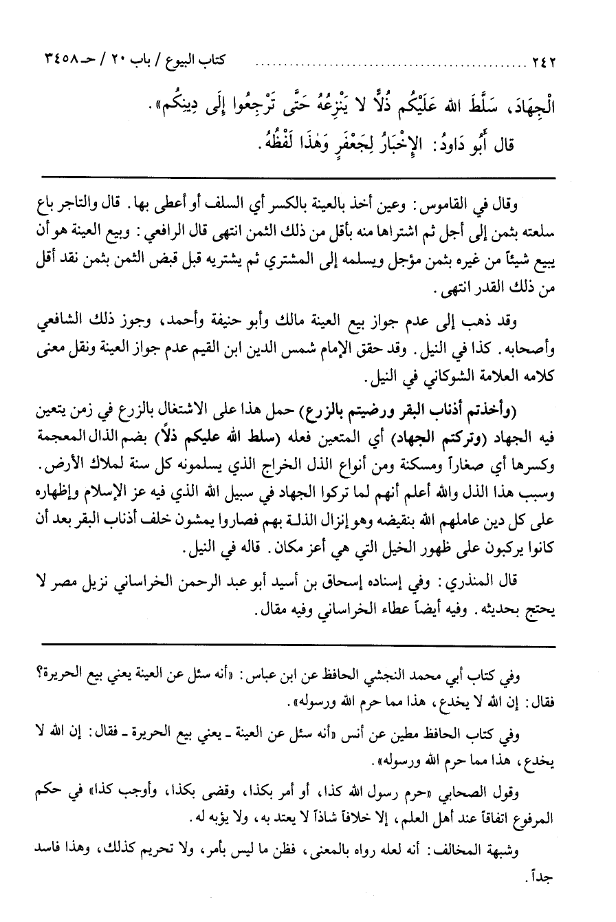 وقد حقق الإمام بن الْقَيِّمِ عَدَمَ جَوَازِ الْعِينَةِ وَنَقَلَ مَعْنَى كَلَامِهِ الْعَلَّامَةُ الشَّوْكَانِيُّ فِي النَّيْلِ