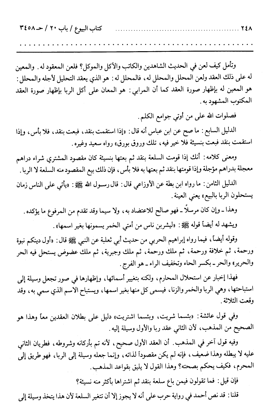الدليل الثامن ما رواه بن بَطَّة عَنْ الْأَوْزَاعِيِّ قَالَ قَالَ رَسُول اللَّه يَأْتِي عَلَى النَّاس زَمَان يَسْتَحِلُّونَ الرِّبَا بِالْبَيْعِ يَعْنِي الْعِينَة