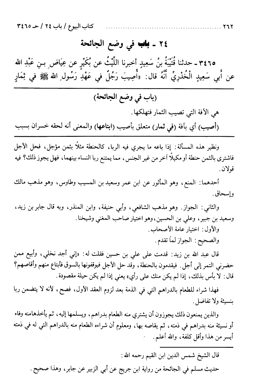 قَالَ الشَّيْخ بن الْقَيِّم رَحِمَهُ اللَّه حَدِيث مُسْلِم فِي الْجَائِحَة من رواية بن جُرَيْجٍ عَنْ أَبِي الزُّبَيْر عَنْ جَابِر وَهَذَا صحيح