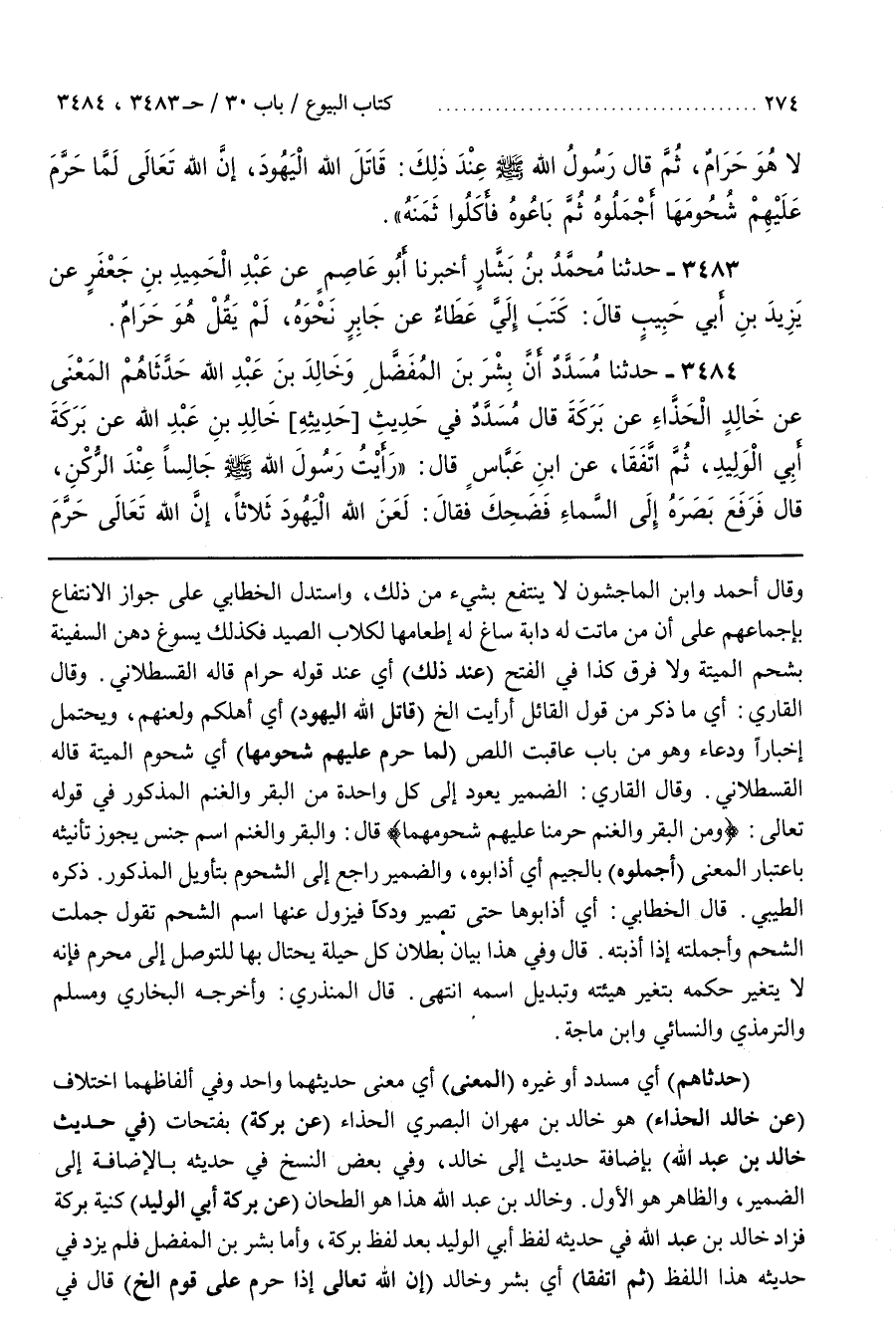 وقال القارىء أَيْ مَا ذُكِرَ مِنْ قَوْلِ الْقَائِلِ أَرَأَيْتَ إِلَخْ (قَاتَلَ اللَّهُ الْيَهُودَ) أَيْ أَهْلَكَهُمْ وَلَعَنَهُمْ وَيُحْتَمَلُ إِخْبَارًا وَدُعَاءً هُوَ مِنْ بَابِ عَاقَبْتُ اللِّصَّ (لَمَّا حَرَّمَ عَلَيْهِمْ شُحُومَهَا) أَيْ شُحُومَ الميتة قاله القسطلاني