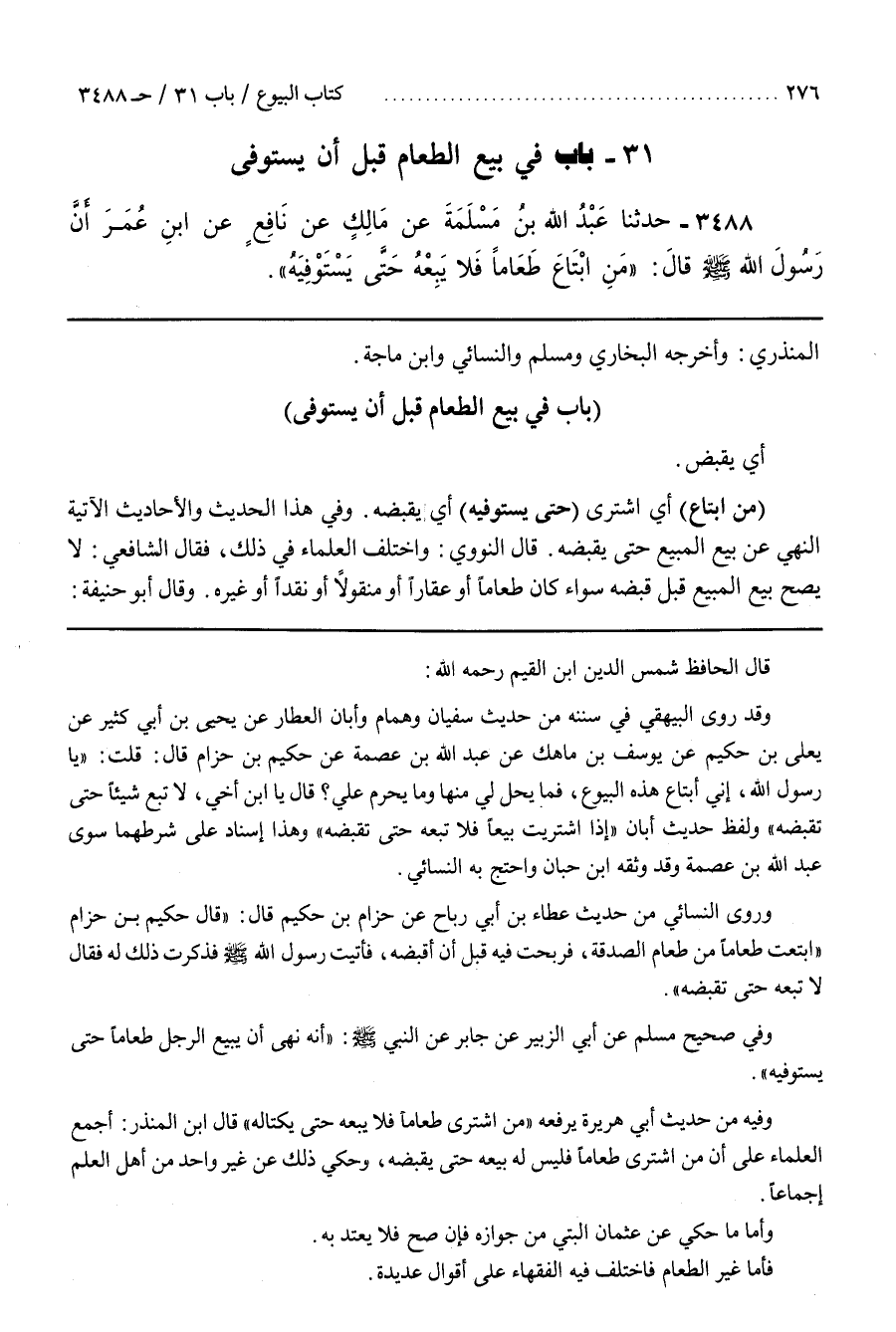 وَرَوَى النَّسَائِيُّ مِنْ حَدِيث عَطَاء بْن أَبِي رَبَاح عَنْ حِزَام بْن حَكِيم قَالَ قَالَ حَكِيم بْن حِزَام اِبْتَعْت طَعَامًا مِنْ طَعَام الصَّدَقَة فَرَبِحْت فِيهِ قبل أن أقبضه فأتيت رسول الله فَذَكَرْت ذَلِكَ لَهُ فَقَالَ لَا تَبِعْهُ حَتَّى تَقْبِضهُ وَفِي صَحِيح مُسْلِم عَنْ أَبِي الزُّبَيْر عن جابر عن النبي أَنَّهُ نَهَى أَنْ يَبِيع الرَّجُل طَعَامًا حَتَّى يَسْتَوْفِيه وَفِيهِ مِنْ حَدِيث أَبِي هُرَيْرَة يَرْفَعهُ مَنْ اِشْتَرَى طَعَامًا فَلَا يَبِعْهُ حَتَّى يَكْتَالهُ قال بن الْمُنْذِر أَجْمَعَ الْعُلَمَاء عَلَى أَنَّ مَنْ اِشْتَرَى طَعَامًا فَلَيْسَ لَهُ بَيْعه حَتَّى يَقْبِضهُ وَحُكِيَ ذَلِكَ عَنْ غَيْر وَاحِد مِنْ أَهْل الْعِلْم إجماعا