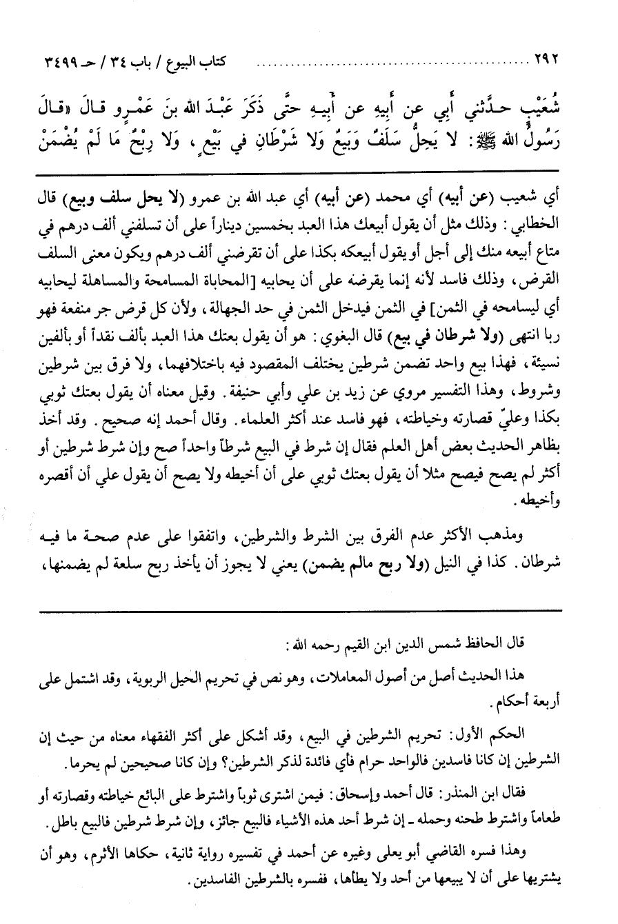 أَيْ شُعَيْبٌ (عَنْ أَبِيهِ أَيْ مُحَمَّدٍ عَنْ أَبِيهِ) أَيْ عَبْدِ اللَّهِ بْنِ عَمْرِو (لَا يَحِلُّ سَلَفٌ وَبَيْعٌ) قَالَ الْخَطَّابِيُّ وَذَلِكَ مِثْلَ أَنْ يَقُولَ أَبِيعُكُ هَذَا الْعَبْدَ بِخَمْسِينَ دِينَارًا عَلَى أَنْ تُسَلِّفَنِي أَلْفَ دِرْهَمٍ فِي مَتَاعٍ أَبِيعُهُ مِنْكَ إِلَى أَجَلٍ أَوْ يَقُولُ أَبِيعُكَهُ بِكَذَا عَلَى أَنْ تُقْرِضَنِي أَلْفَ دِرْهَمٍ وَيَكُونُ مَعْنَى السَّلَفِ الْقَرْضُ وَذَلِكَ فَاسِدٌ لِأَنَّهُ يُقْرِضُهُ عَلَى أَنْ يُحَابِيَهُ (الْمُحَابَاةُ الْمُسَامَحَةُ وَالْمُسَاهَلَةُ لِيُحَابِيَهُ أَيْ لِيُسَامِحَهُ فِي الثَّمَنِ) فِي الثَّمَنِ فَيَدْخُلُ الثَّمَنُ فِي حَدِّ الْجَهَالَةِ وَلِأَنَّ كُلَّ قَرْضٍ جَرَّ مَنْفَعَةً فَهُوَ رِبًا انْتَهَى