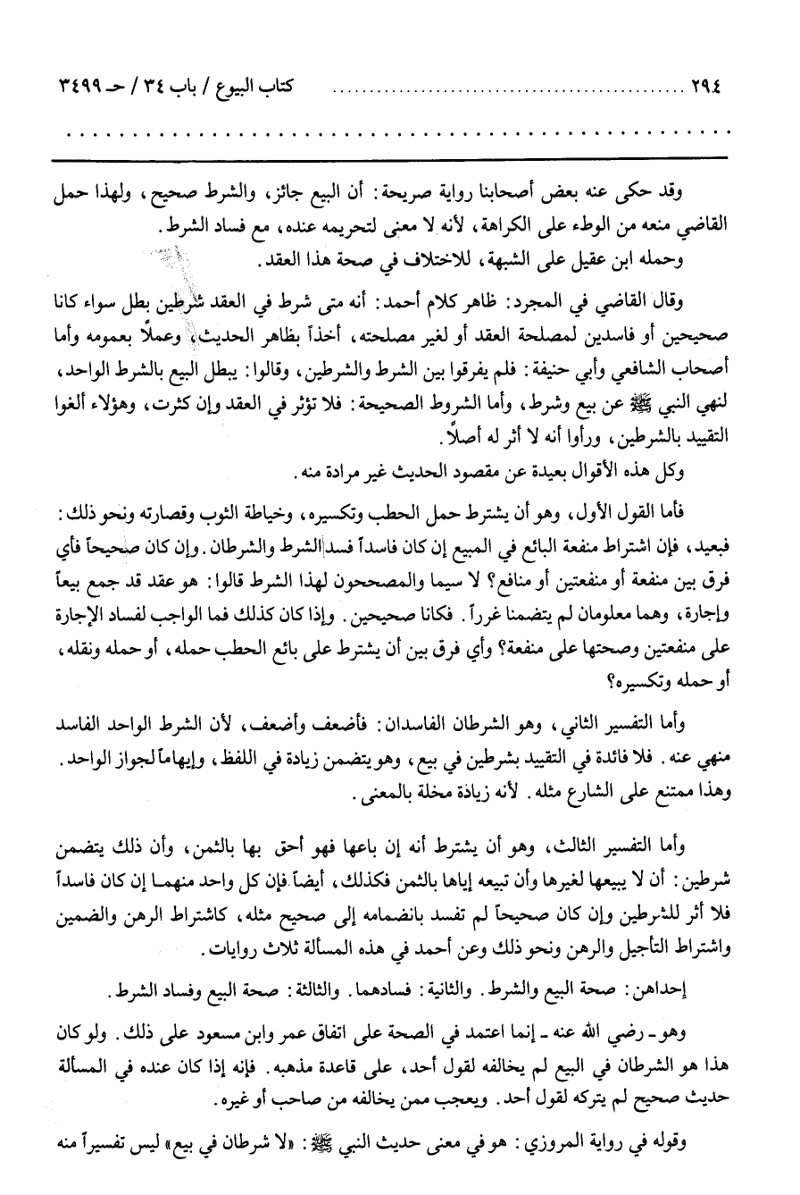 وَقَالَ الْقَاضِي فِي الْمُجَرَّد ظَاهِر كَلَام أَحْمَد أَنَّهُ مَتَى شَرَطَ فِي الْعَقْد شَرْطَيْنِ بطل سواء كانا صَحِيحَيْنِ أَوْ فَاسِدَيْنِ لِمَصْلَحَةِ الْعَقْد أَوْ لِغَيْرِ مَصْلَحَته أَخْذًا بِظَاهِرِ الْحَدِيث وَعَمَلًا بِعُمُومِهِ وَأَمَّا أَصْحَاب الشَّافِعِيّ وَأَبِي حَنِيفَة فَلَمْ يُفَرِّقُوا بَيْن الشَّرْط وَالشَّرْطَيْنِ وَقَالُوا يَبْطُل الْبَيْع بِالشَّرْطِ الْوَاحِد لنهي النبي عَنْ بَيْع وَشَرْط وَأَمَّا الشُّرُوط الصَّحِيحَة فَلَا تُؤَثِّر فِي الْعَقْد وَإِنْ كَثُرَتْ وَهَؤُلَاءِ أَلْغَوْا التَّقْيِيد بِالشَّرْطَيْنِ وَرَأَوْا أَنَّهُ لَا أَثَر لَهُ أَصْلًا