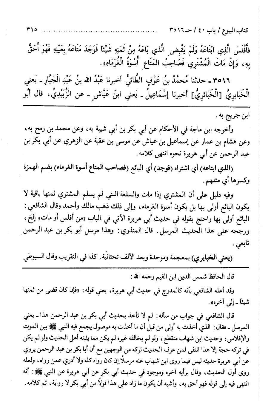 قَالَ الشَّافِعِيّ فِي جَوَاب مَنْ سَأَلَهُ لِمَ لَا تَأْخُذ بِحَدِيثِ أَبِي بَكْر بْن عَبْد الرَّحْمَن هَذَا يَعْنِي الْمُرْسَل فَقَالَ الَّذِي أَخَذْت بِهِ أَوْلَى مِنْ قِبَل أَنَّ مَا أَخَذْتُ بِهِ مَوْصُول يَجْمَع فِيهِ النَّبِيّ صَلَّى اللَّه عَلَيْهِ وَسَلَّمَ بين الموت والإفلاس وحديث بن شِهَاب مُنْقَطِع وَلَوْ لَمْ يُخَالِفهُ غَيْره لَمْ يَكُنْ مِمَّا يُثْبِتُهُ أَهْل الْحَدِيث وَلَوْ لَمْ يَكُنْ فِي تَرْكِهِ حُجَّة إِلَّا هَذَا اِنْتَفَى لِمَنْ عَرَفَ الْحَدِيث تَرَكَهُ مِنْ الْوَجْهَيْنِ مَعَ أَنَّ أَبَا بَكْر بْن عَبْد الرَّحْمَن يَرْوِي عَنْ أَبِي هُرَيْرَة حَدِيثه لَيْسَ فِيمَا رَوَى بن شِهَاب عَنْهُ مُرْسَلًا إِنْ كَانَ رَوَاهُ كُلّه وَلَا أَدْرِي عَمَّنْ رَوَاهُ وَلَعَلَّهُ رَوَى أَوَّل الْحَدِيث وَقَالَ بِرَأْيِهِ آخِره وَمَوْجُود فِي حَدِيث أَبِي بَكْر عَنْ أَبِي هُرَيْرَة عَنْ النَّبِيّ صَلَّى اللَّه عَلَيْهِ وَسَلَّمَ أَنَّهُ اِنْتَهَى فِيهِ إِلَى قَوْله فَهُوَ أَحَقّ بِهِ وَأَشْبَهَ أَنْ يَكُون مَا زَادَ عَلَى هَذَا قَوْلًا مِنْ أَبِي بَكْر لَا رِوَايَة تَمَّ كَلَامه