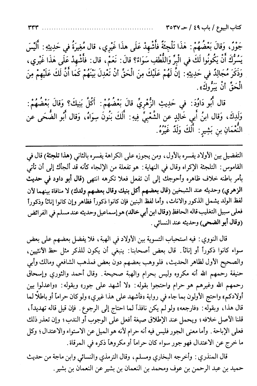 قَالَ النَّوَوِيُّ فِيهِ اسْتِحْبَابُ التَّسْوِيَةِ بَيْنَ الْأَوْلَادِ فِي الْهِبَةِ فَلَا يُفَضِّلُ بَعْضَهُمْ عَلَى بَعْضٍ سَوَاءٌ كَانُوا ذُكُورًا أَوْ إِنَاثًا