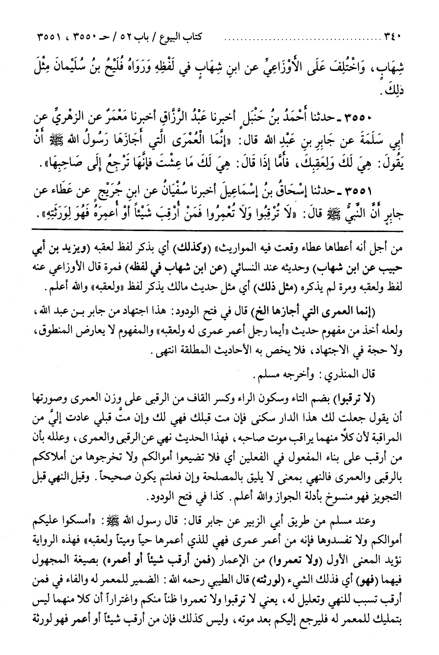 وَعِنْدَ مُسْلِمٍ مِنْ طَرِيقِ أَبِي الزُّبَيْرِ عَنْ جَابِرٍ قَالَ قَالَ رَسُولُ اللَّهِ صَلَّى اللَّهُ عَلَيْهِ وَسَلَّمَ أَمْسِكُوا عَلَيْكُمْ أَمْوَالَكُمْ وَلَا تُفْسِدُوهَا فَإِنَّهُ مَنْ أُعْمِرَ عُمْرَى فَهِيَ لِلَّذِي أُعْمِرَهَا حَيًّا وَمَيِّتًا وَلِعَقِبِهِ فَهَذِهِ الرِّوَايَةُ تُؤَيِّدُ الْمَعْنَى الْأَوَّلَ (وَلَا تُعْمِرُوا مِنَ الْإِعْمَارِ (فَمَنْ أُرْقِبَ شَيْئًا أَوْ أُعْمِرَهُ) بِصِيغَةِ الْمَجْهُولِ فِيهِمَا (فَهُوَ أَيْ) فَذَلِكَ الشَّيْءُ لِوَرَثَتِهِ قَالَ الطِّيبِيُّ رَحِمَهُ اللَّهُ الضَّمِيرُ لِلْمُعْمَرِ لَهُ وَالْفَاءُ فِي فَمَنْ أُرْقِبَ تَسَبُّبٌ لِلنَّهْيِ وَتَعْلِيلٌ لَهُ يَعْنِي لَا تُرْقِبُوا وَلَا تُعْمِرُوا ظَنًّا مِنْكُمْ وَاغْتِرَارًا أَنَّ كُلًّا مِنْهُمَا لَيْسَ بِتَمْلِيكٍ لِلْمُعْمَرِ لَهُ فَيَرْجِعُ إِلَيْكُمْ بَعْدَ مَوْتِهِ وَلَيْسَ كَذَلِكَ فَإِنَّ مَنْ أُرْقِبَ شَيْئًا أَوْ أُعْمِرَ فَهُوَ لورثة