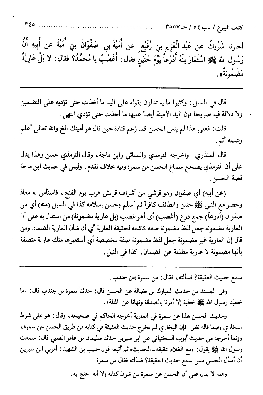 [3562] (عَنْ أَبِيهِ) أَيْ صَفْوَانَ وَهُوَ قُرَشِيٌّ مِنْ أَشْرَافِ قُرَيْشٍ هَرَبَ يَوْمَ الْفَتْحِ فَاسْتَأْمَنَ لَهُ مُعَاذٌ وَحَضَرَ مَعَ النَّبِيِّ صلى الله عليه وسلم حنين وَالطَّائِفَ كَافِرًا ثُمَّ أَسْلَمَ وَحَسُنَ إِسْلَامُهُ كَذَا فِي السُّبُلِ (مِنْهُ) أَيْ مِنْ صَفْوَانَ (أَدْرُعًا) جَمْعُ دِرْعٍ (أَغَصْبٌ) أَيْ أَهُوَ غَصْبٌ (بَلْ عَارِيَةٌ مَضْمُونَةٌ) مَنِ اسْتَدَلَّ بِهِ عَلَى أَنَّ الْعَارِيَةَ مَضْمُونَةٌ جَعَلَ لَفْظَ مَضْمُونَةٍ صِفَةً كَاشِفَةً لِحَقِيقَةِ الْعَارِيَةِ أَيْ أَنَّ شَأْنَ الْعَارِيَةَ الضَّمَانُ وَمَنْ قَالَ إِنَّ الْعَارِيَةَ غَيْرُ مَضْمُونَةٍ جَعَلَ لَفْظَ مَضْمُونَةٍ صِفَةً مُخَصِّصَةً أَيْ أَسْتَعِيرُهَا مِنْكَ عَارِيَةً مُتَّصِفَةً بِأَنَّهَا مَضْمُونَةٌ لَا عَارِيَةً مُطْلَقَةً عَنِ الضَّمَانِ كَذَا فِي النَّيْلِ
