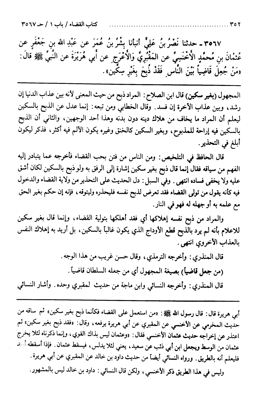 ــــــــــــQأبي هريرة قال قال رسول الله صلى اللَّه عَلَيْهِ وَسَلَّمَ مَنْ اُسْتُعْمِلَ عَلَى الْقَضَاء فَكَأَنَّمَا ذُبِحَ بِغَيْرِ سِكِّين ثُمَّ سَاقَهُ مِنْ حَدِيث الْمَخْرَمِيّ عَنْ الْأَخْنَسِيّ عَنْ الْمَقْبُرِيّ عَنْ أَبِي هُرَيْرَة يَرْفَعهُ وَقَالَ فَقَدْ ذُبِحَ بِغَيْرِ سِكِّينٍ ثُمَّ اِعْتَذَرَ عَنْ إِخْرَاجه حَدِيث عُثْمَان الْأَخْنَسِيّ فَقَالَ وَعُثْمَان لَيْسَ بِذَاكَ الْقَوِيّ وَإِنَّمَا ذَكَرْنَاهُ لِئَلَّا يُخْرِج عُثْمَان مِنْ الْوَسَط وَيَجْعَل بن أَبِي ذِئْب عَنْ سَعِيد يَعْنِي لِئَلَّا يُدَلِّس فَيُسْقِط عُثْمَان