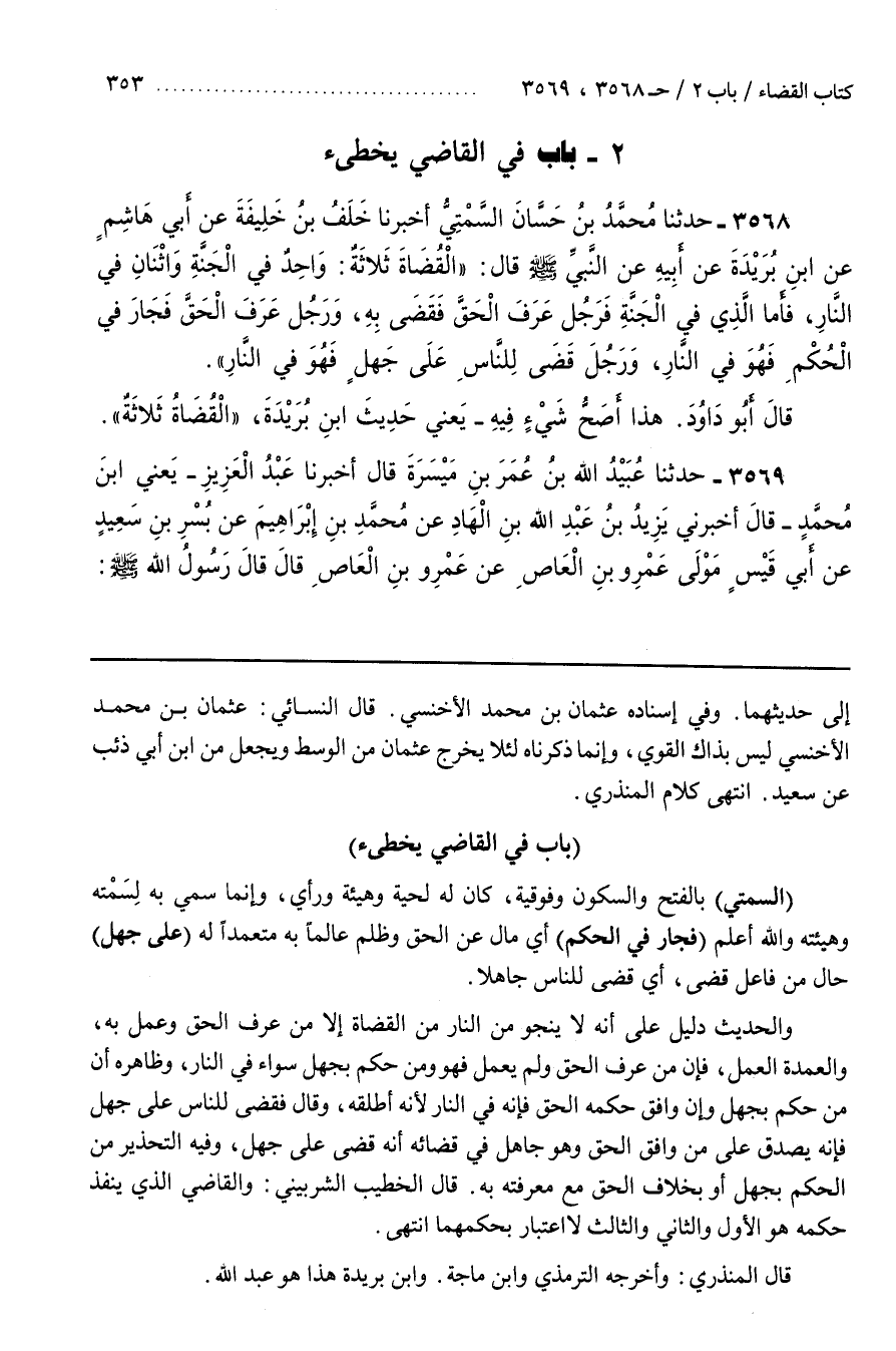 يخطىء (السَّمْتِيُّ) بِالْفَتْحِ وَالسُّكُونِ وَفَوْقِيَّةٌ كَانَ لَهُ لِحْيَةٌ وَهَيْئَةٌ وَرَأْيٌ وَإِنَّمَا سُمِّيَ بِهِ لِسَمْتِهِ وَهَيْئَتِهِ وَاللَّهُ أَعْلَمُ (فَجَارَ فِي الْحُكْمِ) أَيْ مَالَ عَنِ الْحَقِّ وَظَلَمَ عَالِمًا بِهِ مُتَعَمِّدًا لَهُ (عَلَى جَهْلٍ) حَالٌ مِنْ فَاعِلِ قَضَى أَيْ قَضَى لِلنَّاسِ جَاهِلًا