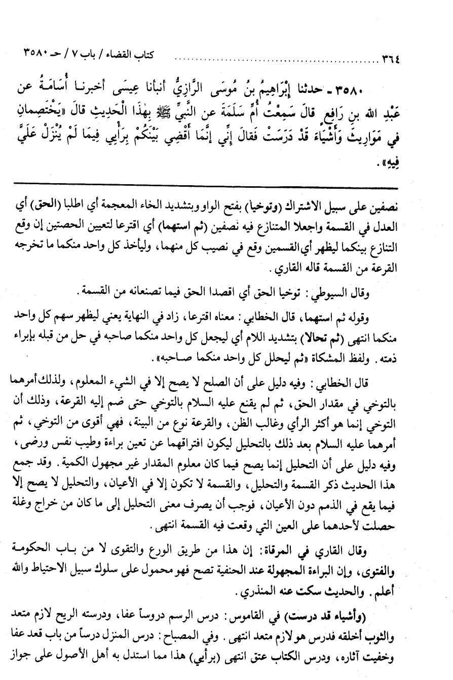 وَقَالَ السُّيُوطِيُّ تَوَخَّيَا الْحَقَّ أَيِ اقْصِدَا الْحَقَّ فِيمَا تَصْنَعَانِهِ مِنَ الْقِسْمَةِ وَقَوْلُهُ ثُمَّ اسْتَهِمَا قَالَ الْخَطَّابِيُّ مَعْنَاهُ اقْتَرِعَا زَادَ فِي النِّهَايَةِ يَعْنِي لِيَظْهَرَ سَهْمُ كُلِّ وَاحِدٍ مِنْكُمَا انْتَهَى