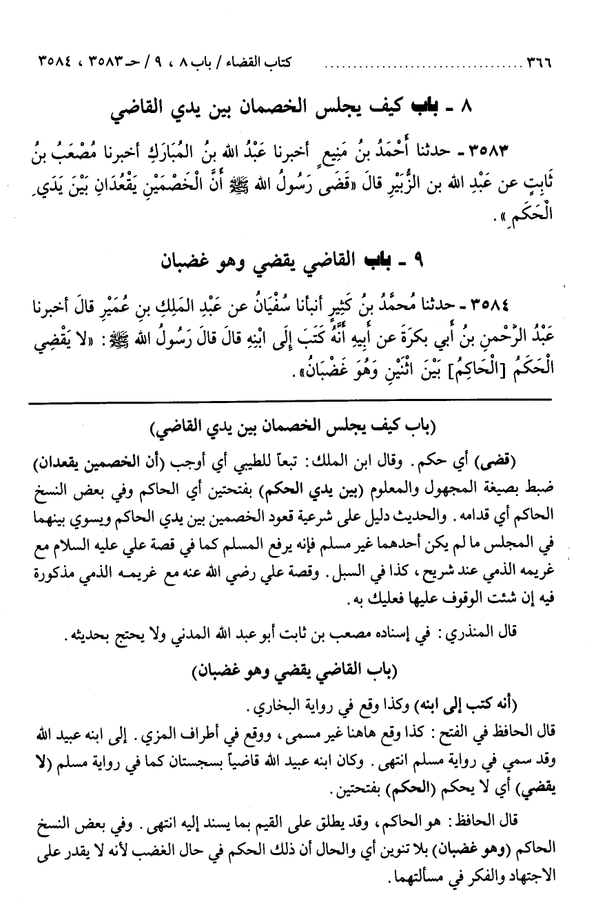وقال بن الْمَلَكِ تَبَعًا لِلطِّيبِيِّ أَيْ أَوْجَبَ (أَنَّ الْخَصْمَيْنِ يَقْعُدَانِ) ضُبِطَ بِصِيغَةِ الْمَجْهُولِ وَالْمَعْلُومِ (بَيْنَ يَدَيِ الْحَكَمِ) بِفَتْحَتَيْنِ أَيِ الْحَاكِمِ وَفِي بَعْضِ النَّسْخِ الْحَاكِمِ أَيْ قُدَّامَهُ