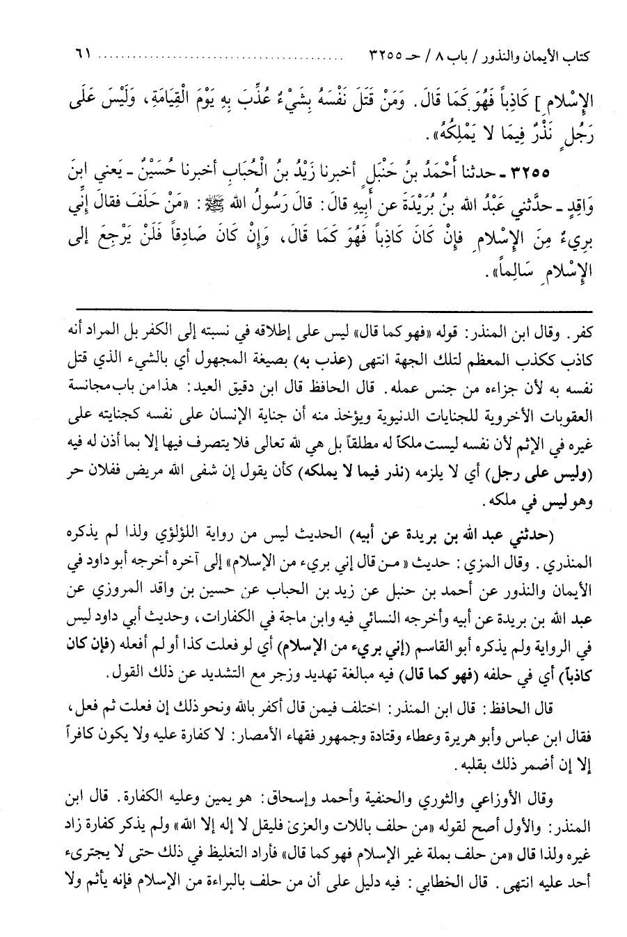وَقَالَ الْمِزِّيُّ حَدِيثُ مَنْ قَالَ إِنِّي بَرِيءٌ مِنَ الْإِسْلَامِ إِلَى آخِرِهِ أَخْرَجَهُ أَبُو دَاوُدَ فِي الْأَيْمَانِ وَالنُّذُورِ عَنْ أَحْمَدَ بْنِ حَنْبَلٍ عَنْ زَيْدِ بْنِ الْحُبَابِ عَنْ حُسَيْنِ بْنِ وَاقِدٍ الْمَرْوَزِيِّ عَنْ عَبْدِ اللَّهِ بْنِ بُرَيْدَةَ عَنْ أَبِيهِ وَأَخْرَجَهُ النسائي فيه وبن مَاجَهْ