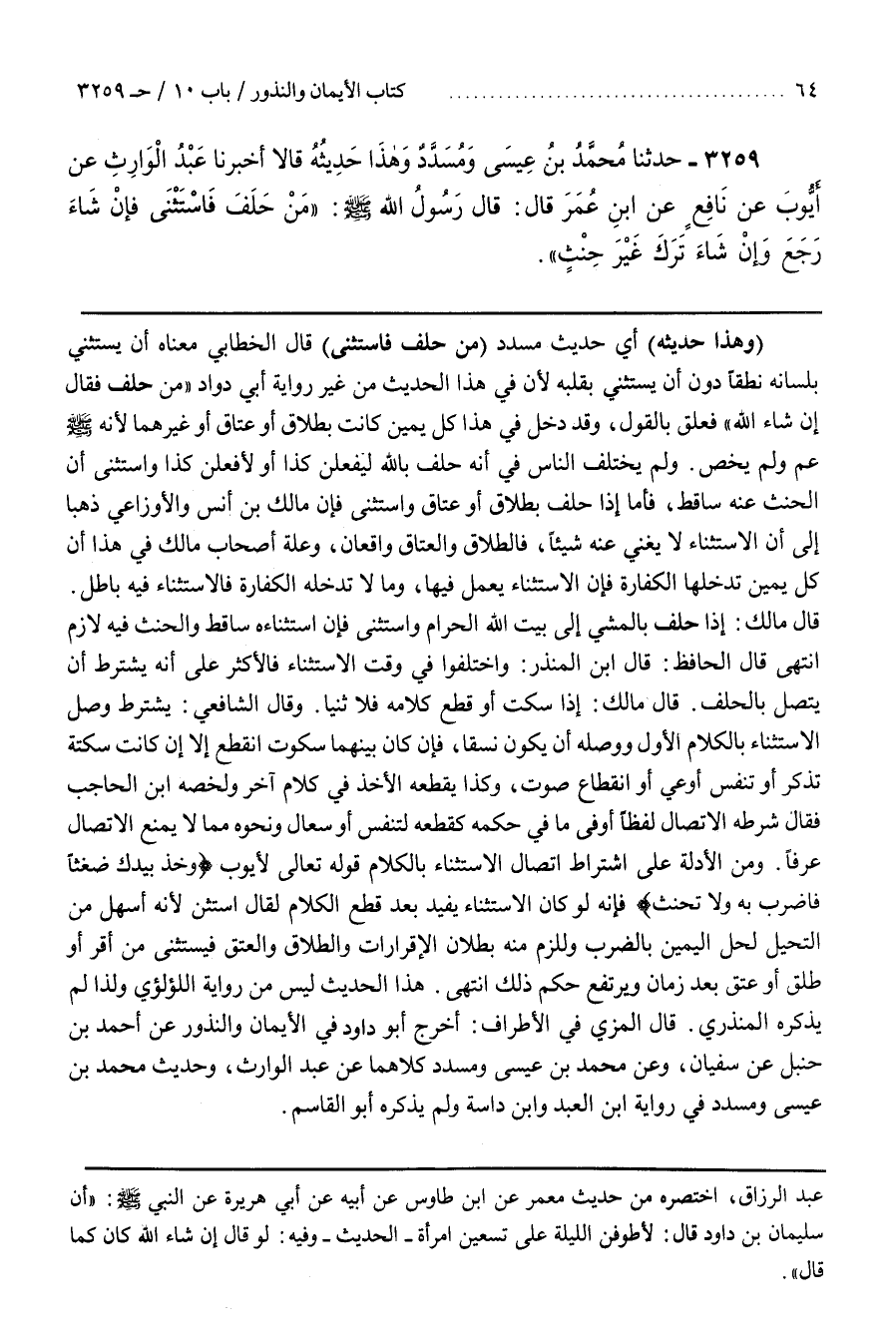 [3262] (وَهَذَا حَدِيثُهُ) أَيْ حَدِيثُ مُسَدَّدٍ (مَنْ حَلَفَ فَاسْتَثْنَى) قَالَ الْخَطَّابِيُّ مَعْنَاهُ أَنْ يَسْتَثْنِيَ بِلِسَانِهِ نُطْقًا دُونَ أَنْ يَسْتَثْنِيَ بِقَلْبِهِ لِأَنَّ فِي هَذَا الْحَدِيثِ مِنْ غَيْرِ رِوَايَةِ أَبِي دَاوُدَ مَنْ حَلَفَ فَقَالَ إِنْ شَاءَ اللَّهُ وَقَدْ دَخَلَ فِي هَذَا كُلُّ يَمِينٍ كَانَتْ بِطَلَاقٍ أَوْ عَتَاقٍ أَوْ غَيْرِهِمَا لِأَنَّهُ صَلَّى اللَّهُ عَلَيْهِ وَسَلَّمَ عَمَّ وَلَمْ يَخُصَّ