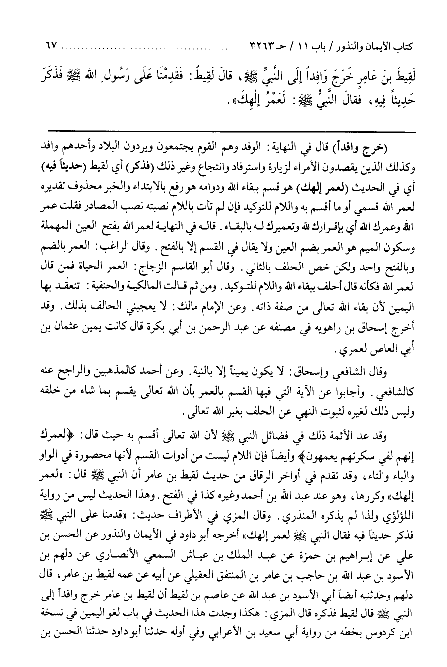 [3266] (خَرَجَ وَافِدًا) قَالَ فِي النِّهَايَةِ الْوَفْدُ وَهُمُ الْقَوْمُ يَجْتَمِعُونَ وَيَرِدُونَ الْبِلَادَ وَأَحَدُهُمْ وَافِدٌ وَكَذَلِكَ الَّذِينَ يَقْصِدُونَ الْأُمَرَاءَ لِزِيَارَةٍ وَاسْتِرْفَادٍ وَانْتِجَاعٍ وَغَيْرِ ذَلِكَ (فَذَكَرَ) أَيْ لَقِيطٌ (حَدِيثًا فِيهِ) أَيْ فِي الْحَدِيثِ (لَعَمْرُ إِلَهِكَ) هُوَ قَسَمٌ بِبَقَاءِ اللَّهِ وَدَوَامِهِ وَهُوَ رُفِعَ بِالِابْتِدَاءِ وَالْخَبَرُ مَحْذُوفٌ وَتَقْدِيرُهُ لَعَمْرُ اللَّهِ قَسَمِي أَوْ مَا أُقْسِمُ بِهِ وَاللَّامُ لِلتَّوْكِيدِ فَإِنْ لَمْ تَأْتِ بِاللَّامِ نَصَبَتَهُ نَصْبَ الْمَصَادِرِ فَقُلْتَ عَمْرَ اللَّهِ وَعَمْرُكَ اللَّهَ أَيْ بِإِقْرَارِكَ لِلَّهِ وَهُوَ تَعْمِيرُكَ لَهُ بِالْبَقَاءِ