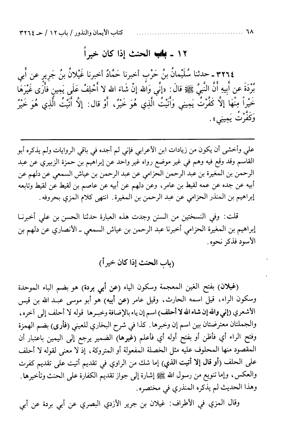 [3276] (غَيْلَانُ) بِفَتْحِ الْغَيْنِ الْمُعْجَمَةِ وَسُكُونِ الْيَاءِ (عَنْ أَبِي بُرْدَةَ) هُوَ بِضَمِّ الْبَاءِ الْمُوَحَّدَةِ وَسُكُونِ الرَّاءِ قِيلَ اسْمُهُ الْحَارِثُ وَقِيلَ عَامِرٌ (عَنْ أَبِيهِ) هُوَ أَبُو مُوسَى عَبْدُ اللَّهِ بْنُ قَيْسٍ الْأَشْعَرِيُّ (إِنِّي وَاللَّهِ إِنْ شَاءَ اللَّهُ لَا أَحْلِفُ) اسْمُ إِنَّ يَاءُ الْإِضَافَةِ وَخَبَرُهَا قَوْلُهُ لَا أَحْلِفُ إِلَى آخِرِهِ وَالْجُمْلَتَانِ مُعْتَرِضَتَانِ بَيْنَ اسْمِ إِنَّ وَخَبَرِهَا