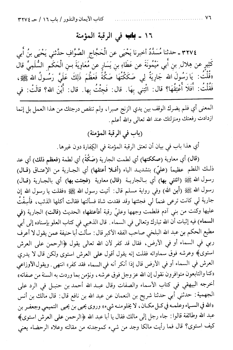 [3282] أَيْ هَذَا بَابٌ فِي بَيَانِ أَنْ تُعْتَقَ الرَّقَبَةُ الْمُؤْمِنَةُ فِي الْكَفَّارَةِ دُونَ غَيْرِهَا (قَالَ) أَيْ مُعَاوِيَةُ (صَكَكْتُهَا) أَيْ لَطَمْتُ الْجَارِيَةَ (صَكَّةً) أَيْ لَطْمَةً (فَعَظَّمَ ذَلِكَ) أَيْ عَدَّ ذَلِكَ اللَّطْمَ عَظِيمًا (عَلَيَّ) بِتَشْدِيدِ الْيَاءِ (أَفَلَا أُعْتِقُهَا) أَيِ الْجَارِيَةَ مِنَ الْإِعْتَاقِ (قَالَ) رَسُولُ اللَّهِ صَلَّى اللَّهُ عَلَيْهِ وَسَلَّمَ (ائْتِنِي بِهَا) أَيْ بِالْجَارِيَةِ (قَالَ) مُعَاوِيَةُ (فَجِئْتُ بِهَا) أَيْ بِالْجَارِيَةِ (قَالَ) رَسُولُ اللَّهِ صَلَّى اللَّهُ عَلَيْهِ وَسَلَّمَ (أَيْنَ اللَّهُ) وَفِي رِوَايَةِ مُسْلِمٍ قَالَ أَتَيْتُ رَسُولَ اللَّهِ صَلَّى اللَّهُ عَلَيْهِ وَسَلَّمَ فَقُلْتُ يارسول اللَّهِ إِنَّ جَارِيَةً لِي كَانَتْ تَرْعَى غَنَمًا لِي فَجِئْتُهَا وَقَدْ فَقَدَتْ شَاةً فَسَأَلْتُهَا فَقَالَتْ أَكَلَهَا الذِّئْبُ فَأَسِفْتُ عَلَيْهَا وَكُنْتُ مِنْ بَنِي آدَمَ فَلَطَمْتُ وَجْهَهَا وَعَلَيَّ رَقَبَةٌ أَفَأُعْتِقُهَا الْحَدِيثُ (قَالَتِ) الْجَارِيَةُ (فِي السَّمَاءِ) فِيهِ إِثْبَاتُ أَنَّ اللَّهَ تَبَارَكَ وَتَعَالَى فِي السَّمَاءِ
