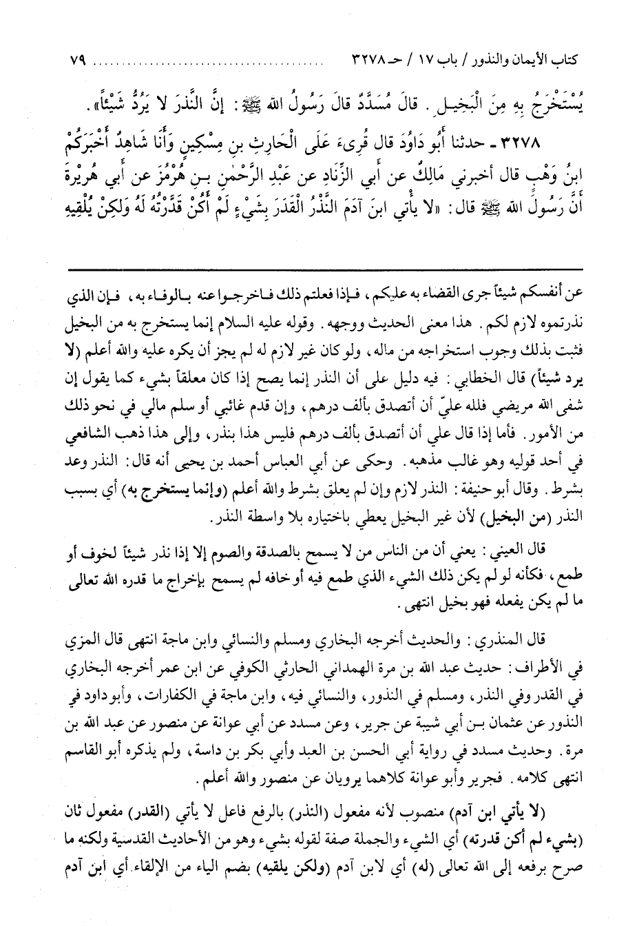 [3288] (لا يأتي بن آدَمَ) مَنْصُوبٌ لِأَنَّهُ مَفْعُولٌ (النَّذْرُ) بِالرَّفْعِ فَاعِلٌ لَا يَأْتِي (الْقَدَرَ) مَفْعُولٌ ثَانٍ (بِشَيْءٍ لَمْ أَكُنْ قَدَّرْتُهُ) أَيِ الشَّيْءَ وَالْجُمْلَةُ صِفَةٌ لِقَوْلِهِ بِشَيْءٍ وَهُوَ مِنَ الْأَحَادِيثِ الْقُدُسِيَّةِ وَلَكِنَّهُ مَا صَرَّحَ بِرَفْعِهِ إِلَى اللَّهِ تَعَالَى (لَهُ) أَيْ لِابْنِ آدَمَ (وَلَكِنْ يُلْقِيهِ) بِضَمِّ الْيَاءِ مِنَ الإلقاء أي بن آدم