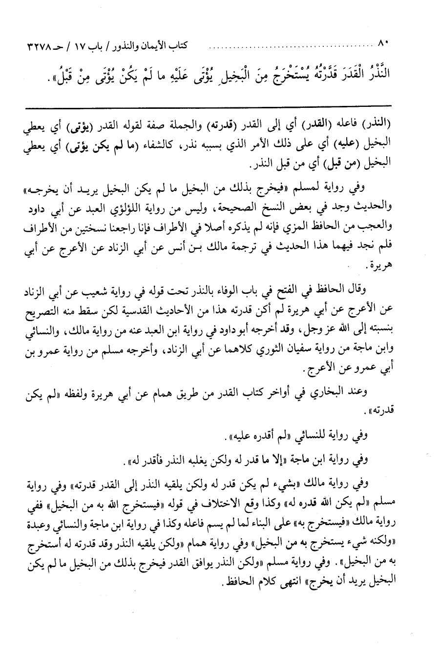 وَقَالَ الْحَافِظُ فِي الْفَتْحِ فِي بَابِ الْوَفَاءِ بِالنَّذْرِ تَحْتَ قَوْلِهِ فِي رِوَايَةِ شُعَيْبٍ عَنْ أَبِي الزِّنَادِ عَنْ الْأَعْرَجِ عَنْ أَبِي هُرَيْرَةَ لَمْ أَكُنْ قَدَّرْتُهُ هَذَا مِنَ الْأَحَادِيثِ الْقُدُسِيَّةِ لَكِنْ سَقَطَ مِنْهُ التَّصْرِيحُ بِنِسْبَتِهِ إلى الله عزوجل وقد أخرجه أبو داود في رواية بن العبد عنه من رواية مالك والنسائي وبن مَاجَهْ مِنْ رِوَايَةِ سُفْيَانَ الثَّوْرِيِّ كِلَاهُمَا عَنْ أَبِي الزِّنَادِ وَأَخْرَجَهُ مُسْلِمٌ مِنْ رِوَايَةِ عَمْرِو بْنِ أَبِي عَمْرِو عَنِ الْأَعْرَجِ