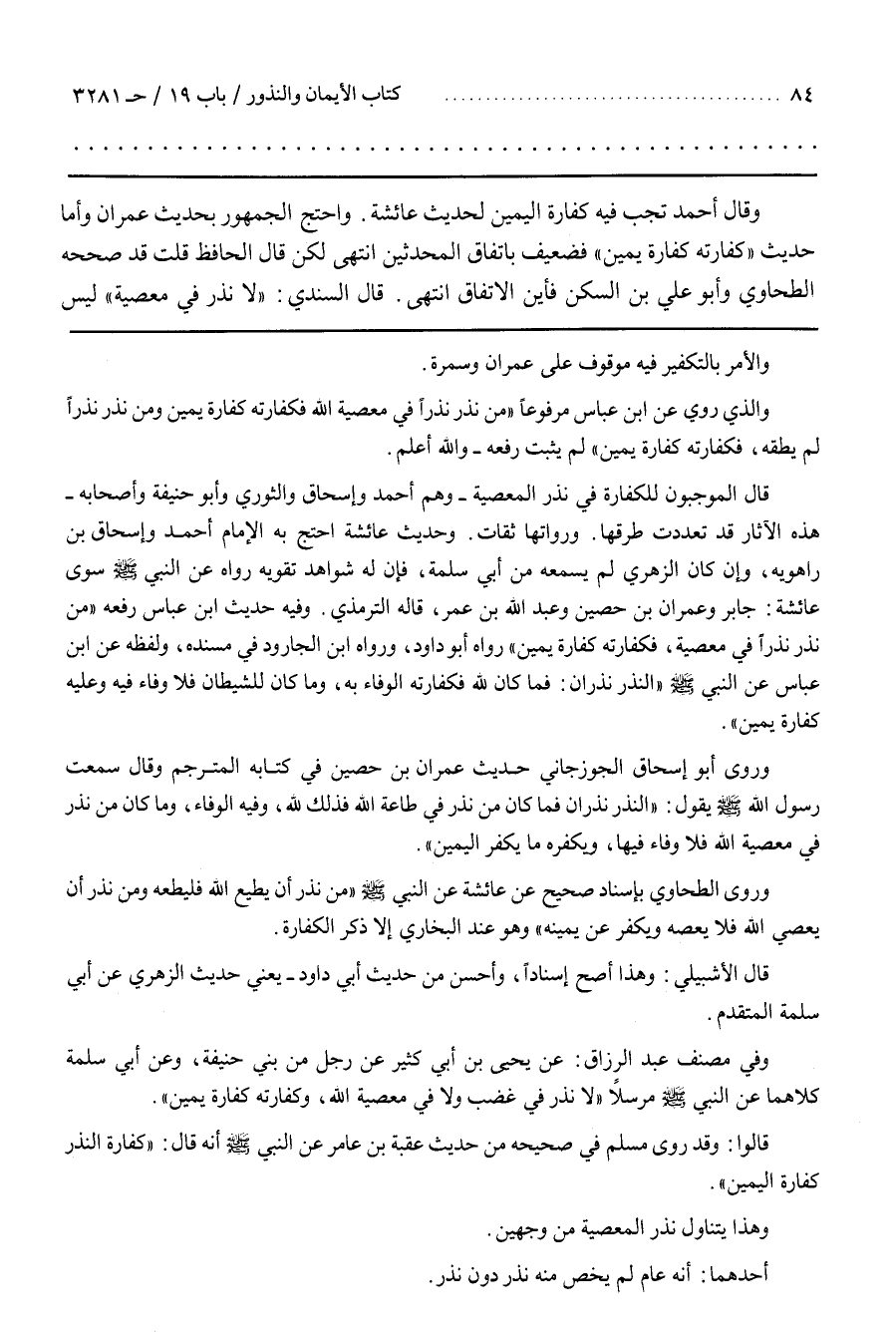 وَحَدِيث عَائِشَة اِحْتَجَّ بِهِ الْإِمَام أَحْمَد وَإِسْحَاق بْن رَاهْوَيْهِ وَإِنْ كَانَ الزُّهْرِيُّ لَمْ يَسْمَعهُ مِنْ أَبِي سَلَمَة فَإِنَّ لَهُ شَوَاهِد تُقَوِّيه رَوَاهُ عَنْ النَّبِيّ صَلَّى اللَّه عَلَيْهِ وَسَلَّمَ سِوَى عَائِشَة جَابِر وَعِمْرَان بْن حُصَيْنٍ وَعَبْد اللَّه بْن عُمَر قَالَهُ التِّرْمِذِيّ وفيه حديث بن عَبَّاس رَفَعَهُ مَنْ نَذَرَ نَذْرًا فِي مَعْصِيَة فَكَفَّارَته كَفَّارَة يَمِين رَوَاهُ أَبُو دَاوُدَ وَرَوَاهُ بن الجارود في مسنده ولفظه عن بن عَبَّاس عَنْ النَّبِيّ صَلَّى اللَّه عَلَيْهِ وَسَلَّمَ النَّذْر نَذْرَانِ فَمَا كَانَ لِلَّهِ فَكَفَّارَته الْوَفَاء بِهِ وَمَا كَانَ لِلشَّيْطَانِ فَلَا وَفَاء فِيهِ وَعَلَيْهِ كَفَّارَة يَمِين وَرَوَى أَبُو إِسْحَاق الْجُوزَجَانِيُّ حَدِيث عِمْرَان بْن حُصَيْنٍ فِي كِتَابه الْمُتَرْجَم وَقَالَ سَمِعْت رَسُول اللَّه صَلَّى اللَّه عَلَيْهِ وَسَلَّمَ يَقُول النَّذْر نَذْرَانِ فَمَا كَانَ مِنْ نَذْر فِي طَاعَة اللَّه فَذَلِكَ لِلَّهِ وَفِيهِ الْوَفَاء وَمَا كَانَ مِنْ نَذْر فِي مَعْصِيَة اللَّه فَلَا وَفَاء فِيهِ وَيُكَفِّرهُ مَا يُكَفِّر الْيَمِين وَرَوَى الطَّحَاوِيُّ بِإِسْنَادٍ صَحِيح عَنْ عَائِشَة عن النبي صلى الله عليه وسلم من نَذَرَ أَنْ يُطِيع اللَّه فَلْيُطِعْهُ وَمَنْ نَذَرَ أَنْ يَعْصِي اللَّه فَلَا يَعْصِهِ وَيُكَفِّر عَنْ يَمِينه وَهُوَ عِنْد الْبُخَارِيّ إِلَّا ذِكْر الْكَفَّارَة