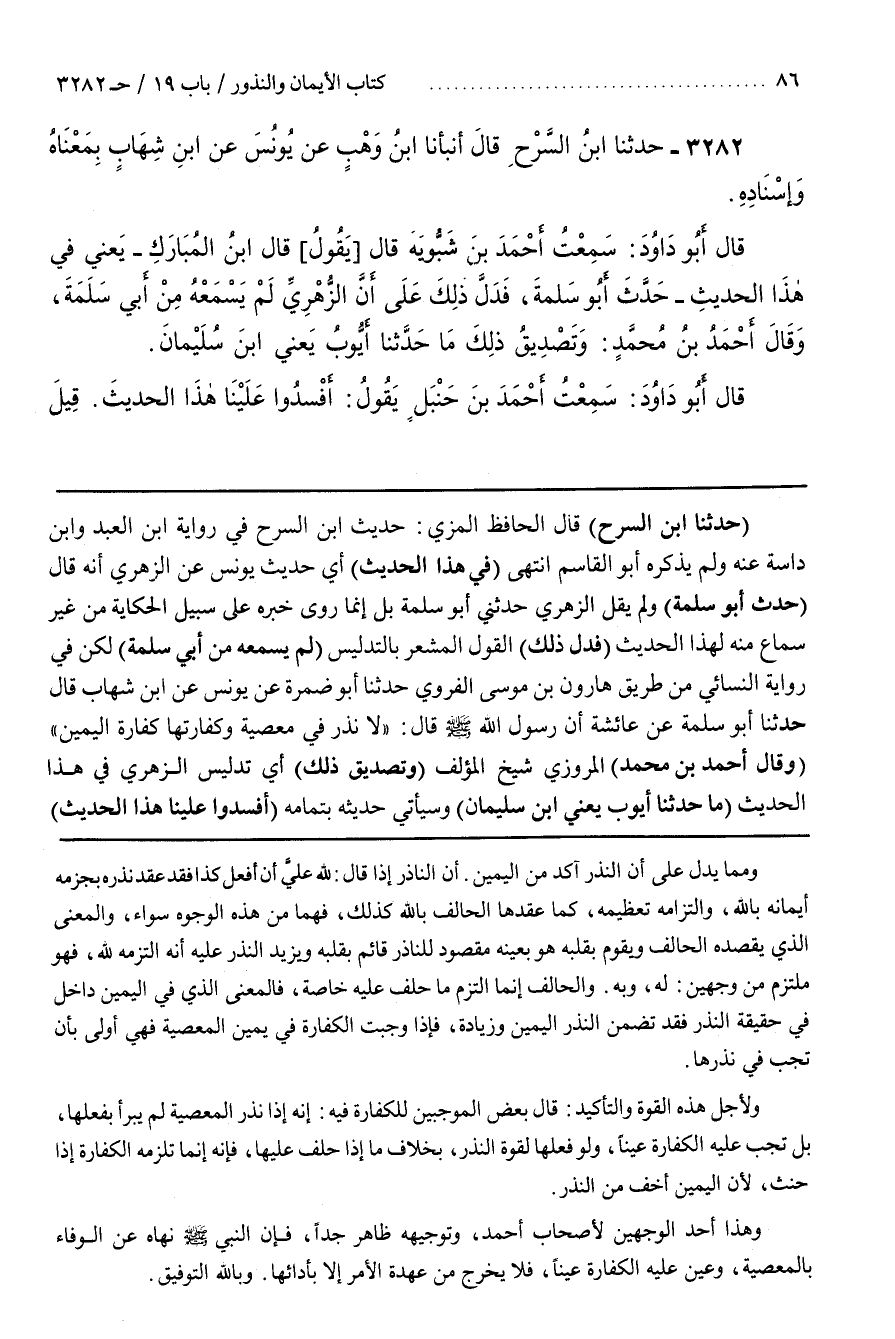[3291] (حدثنا بن السرح) قال الحافظ المزي حديث بن السرح في رواية بن العبد وبن دَاسَةَ عَنْهُ وَلَمْ يَذْكُرْهُ أَبُو الْقَاسِمِ انْتَهَى (فِي هَذَا الْحَدِيثِ) أَيْ حَدِيثِ يُونُسَ عَنِ الزُّهْرِيِّ أَنَّهُ قَالَ (حَدَّثَ أَبُو سَلَمَةَ) وَلَمْ يَقُلِ الزُّهْرِيُّ حَدَّثَنِي أَبُو سَلَمَةَ بَلْ إِنَّمَا رَوَى خَبَرُهُ عَلَى سَبِيلِ الْحِكَايَةِ مِنْ غَيْرِ سَمَاعٍ مِنْهُ لِهَذَا الْحَدِيثِ (فَدَلَّ ذَلِكَ) الْقَوْلُ الْمُشْعِرُ بِالتَّدْلِيسِ (لَمْ يَسْمَعْهُ مِنْ أَبِي سَلَمَةَ) لَكِنْ فِي رِوَايَةِ النَّسَائِيِّ مِنْ طَرِيقِ هَارُونَ بْنِ مُوسَى الْفَرَوِيِّ حَدَّثَنَا أَبُو ضَمْرَةَ عَنْ يونس عن بن شِهَابٍ قَالَ حَدَّثَنَا أَبُو سَلَمَةَ عَنْ عَائِشَةَ أن رسول الله قَالَ لَا نَذْرَ فِي مَعْصِيَةٍ وَكَفَّارَتُهَا كَفَّارَةُ اليمين (وقال أحمد بن محمد) المروزي شيخ الْمُؤَلِّفِ (وَتَصْدِيقُ ذَلِكَ) أَيْ تَدْلِيسُ الزُّهْرِيِّ فِي هذا الحديث (ما حدثنا أيوب يعني بن سُلَيْمَانَ) وَسَيَأْتِي حَدِيثُهُ بِتَمَامِهِ (أَفْسَدُوا عَلَيْنَا هَذَا الحديث)