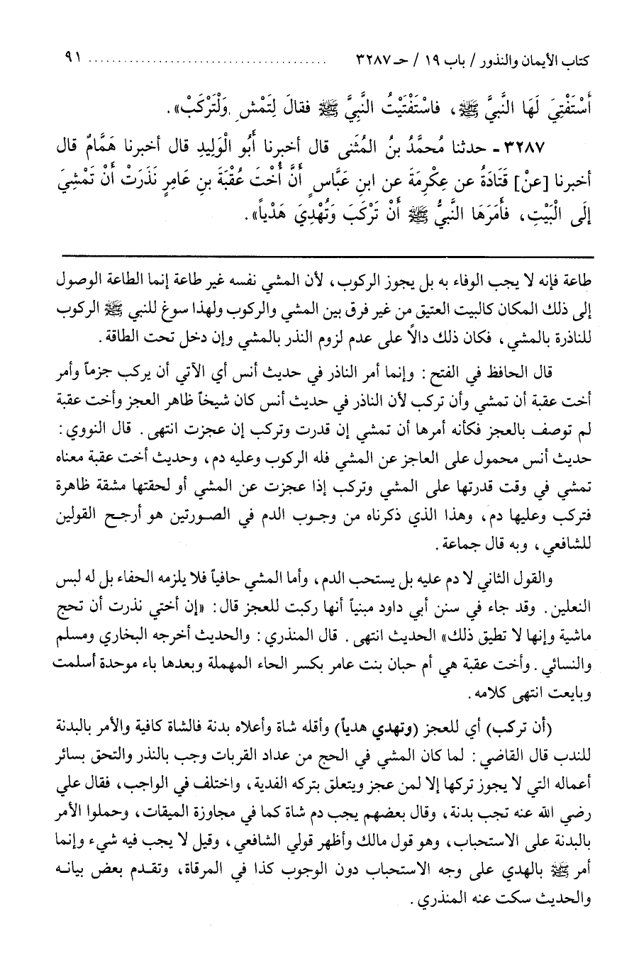 قَالَ الْحَافِظُ فِي الْفَتْحِ وَإِنَّمَا أَمَرَ النَّاذِرَ فِي حَدِيثِ أَنَسٍ أَيِ الْآتِي أَنْ يَرْكَبَ جَزْمًا وَأَمَرَ أُخْتَ عُقْبَةَ أَنْ تَمْشِيَ وَأَنْ تَرْكَبَ لِأَنَّ النَّاذِرَ فِي حَدِيثِ أَنَسٍ كَانَ شَيْخًا ظَاهِرَ الْعَجْزِ وَأُخْتُ عُقْبَةَ لَمْ تُوصَفْ بِالْعَجْزِ فَكَأَنَّهُ أَمَرَهَا أَنْ تَمْشِيَ إِنْ قَدِرَتْ وَتَرْكَبَ إِنْ عَجَزَتَ انْتَهَى