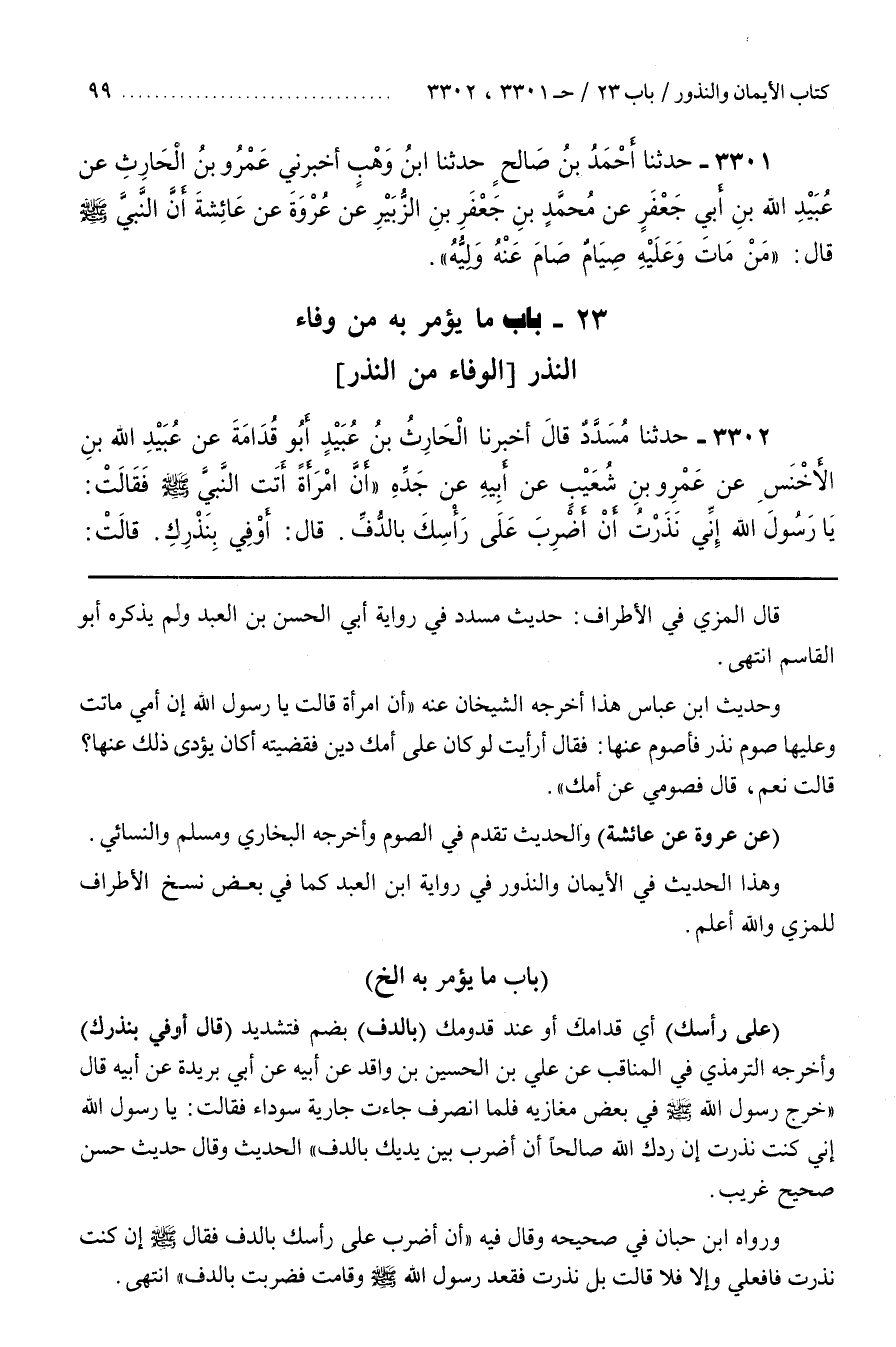[3312] الخ (عَلَى رَأْسِكَ) أَيْ قُدَّامَكَ أَوْ عِنْدَ قُدُومِكَ (بِالدُّفِّ) بِضَمٍّ فَتَشْدِيدٍ (قَالَ أَوْفِي بِنَذْرِكَ) وَأَخْرَجَهُ التِّرْمِذِيُّ فِي الْمَنَاقِبِ عَنْ عَلِيِّ بْنِ الْحُسَيْنِ بن واقد عن أبيه عن بن بُرَيْدَةَ عَنْ أَبِيهِ قَالَ خَرَجَ رَسُولُ اللَّهِ صَلَّى اللَّهُ عَلَيْهِ وَسَلَّمَ فِي بَعْضِ مَغَازِيهِ فلما انصرف جاءت جارية سوداء فقالت يارسول اللَّهِ إِنِّي كُنْتُ نَذَرْتُ إِنْ رَدَّكَ اللَّهُ صالحا أَنْ أَضْرِبَ بَيْنَ يَدَيْكَ بِالدُّفِّ الْحَدِيثُ وَقَالَ حديث حسن صحيح غريب